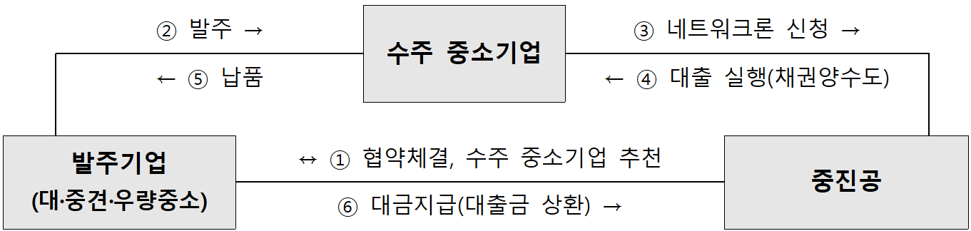 ◦ 중진공이 납품 발주서를 근거로 수주 중소기업에 생산자금을 대출하고, 매입한 매출채권 확정 후 발주기업으로부터 대금 회수