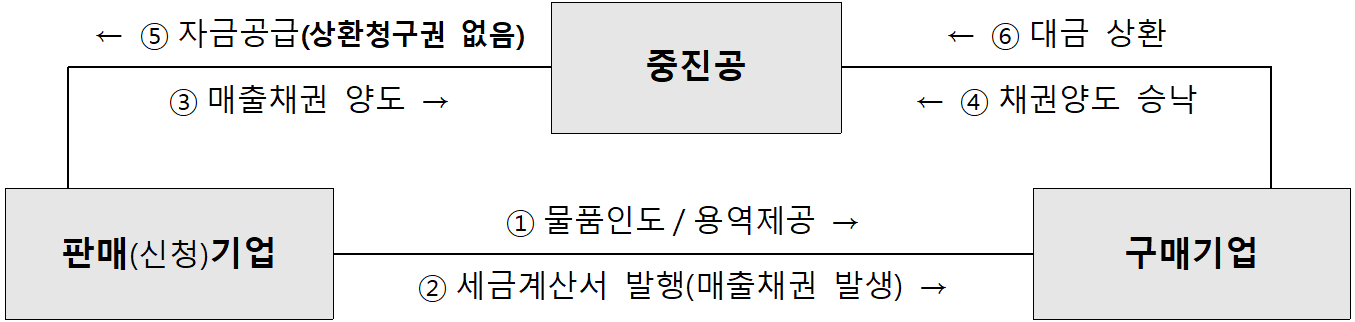 ◦ 중진공이 판매기업의 매출채권을 ‘상환청구권 없이’ 인수하여 자금을 공급하고 구매기업으로부터 매출채권 대금회수