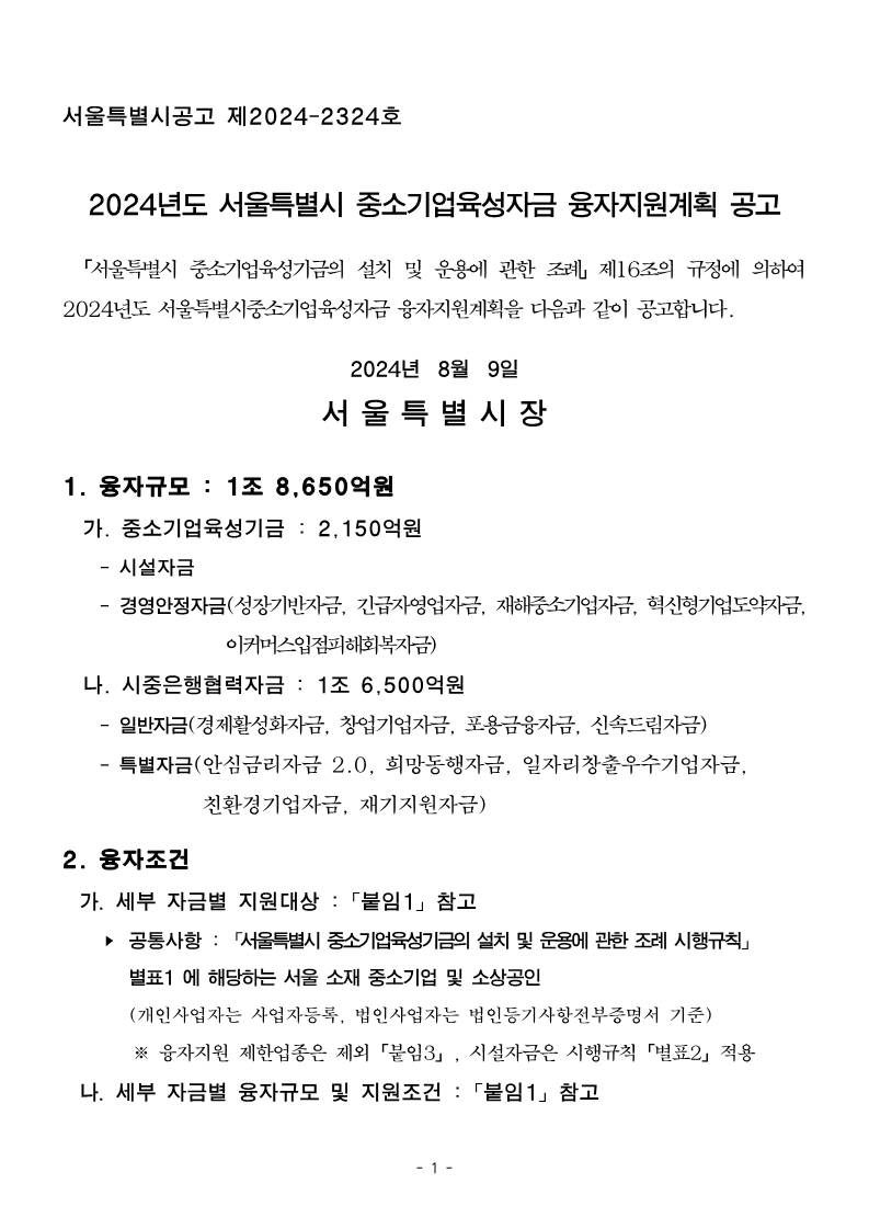 「서울특별시 중소기업육성기금의 설치 및 운용에 관한 조례」제16조의 규정에 의하여 2024년도 서울특별시 중소기업육성자금 융자지원 변경 계획을 다음과 같이 공고합니다.
