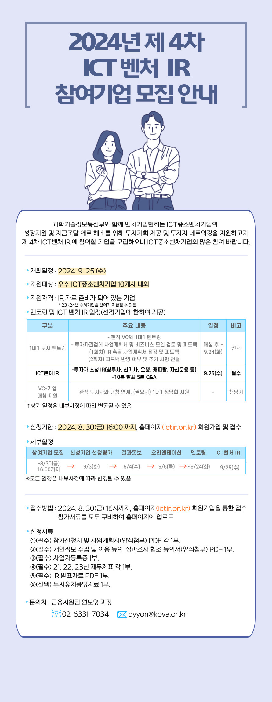 2024년 4차 ICT벤처 IR 참가기업 모집 공고_벤처기업협회 작성자▩정실미▩|작성시간24.08.16|조회수11 목록 댓글 0 글자크기 작게가 글자크기 크게가 포스터_2024 제4차 ICT벤처 투자유치설명회 참여기업 모집안내 (~8.30, 16시까지).jpg352.11KB개인정보수집및+이용+동의성과조사+협조동의서.hwp32.50KB참가신청서+및+사업계획서.hwp33.50KB공모사업 바로가기https://goo.gl/forms/6U4SgcwlXWb836Qr2https://cafe.daum.net/policyfund/HhFz/747https://cafe.daum.net/policyfund/HhFz/344 첨부파일첨부된 파일이 4개 있습니다. jpg 파일 포스터_2024 제4차 ICT벤처 투자유치설명회 참여기업 모집안내 (~8.30, 16시까지).jpg 다운로드 jpg 파일 포스터_2024 제4차 ICT벤처 투자유치설명회 참여기업 모집안내 (~8.30, 16시까지).jpg 다운로드 hwp 파일 개인정보수집및+이용+동의성과조사+협조동의서.hwp 다운로드 hwp 파일 참가신청서+및+사업계획서.hwp 다운로드 다음검색 현재 게시글 추가 기능 열기 북마크 공유하기 신고 센터로 신고 댓글 댓글 0 댓글쓰기 답글쓰기 댓글 리스트
