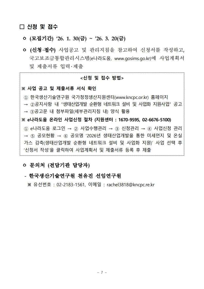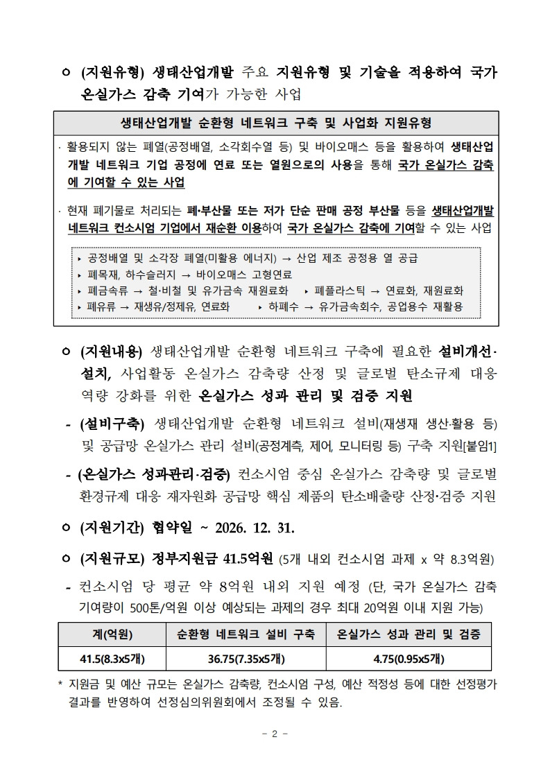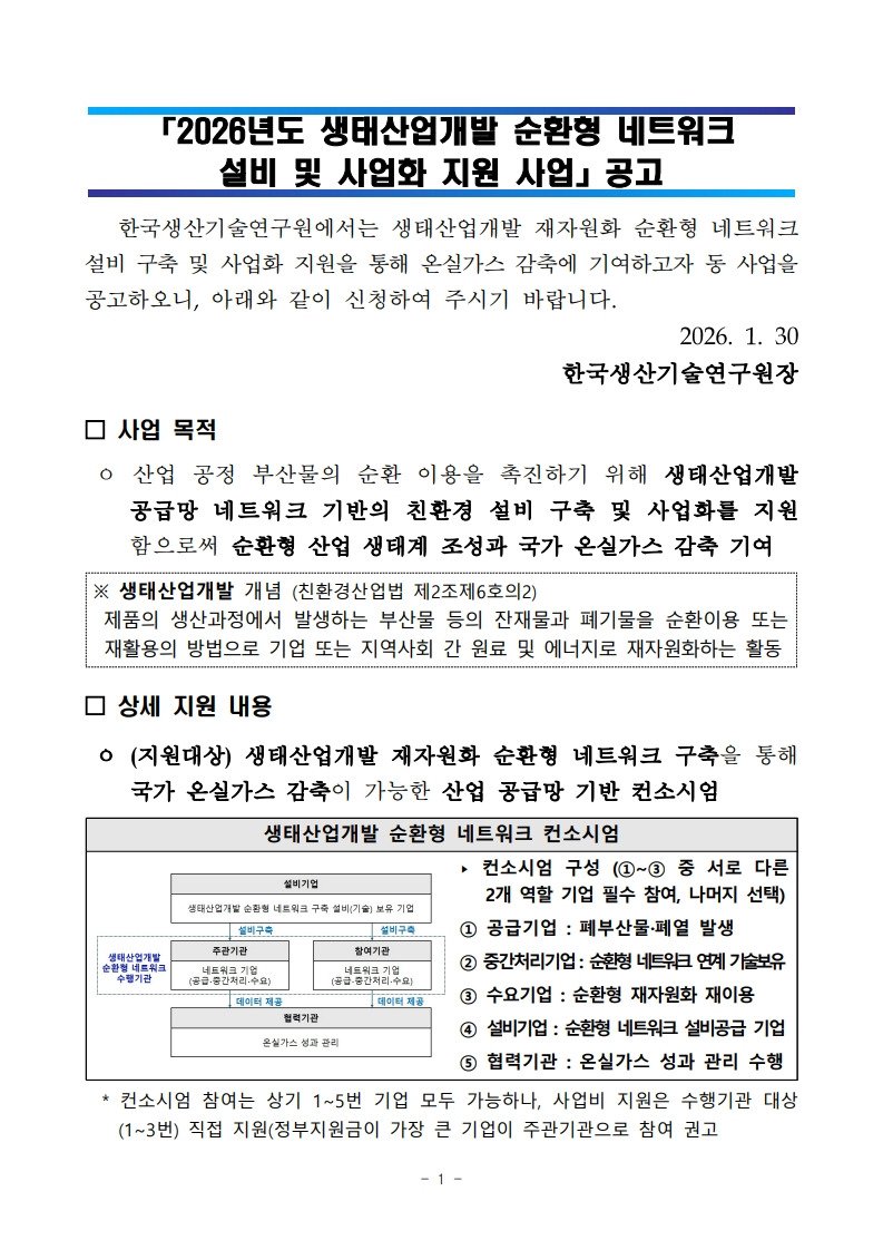 2026년 생태산업개발 순환형 네트워크 설비 및 사업화 지원 사업 공고_한국생산기술연구원 작성자▥정실미▥|작성시간26.02.02|조회수21 목록 댓글 0 글자크기 작게가 글자크기 크게가 [26년도 사업공고문][한국생산기술연구원] 생태산업개발 순환형 네트워크 설비 및 사업화 지원_공고.hwp95.00KB[26년도 세부관리지침(서식포함)][한국생산기술연구원] 생태산업개발 순환형 네트워크 설비 및 사업화 지원_공고.hwp1.31MB공모사업 바로가기https://goo.gl/forms/6U4SgcwlXWb836Qr2https://cafe.daum.net/policyfund/HhFz/789 https://cafe.daum.net/policyfund/HhFz/344 첨부파일첨부된 파일이 15개 있습니다. jpg 파일 1_6.jpg 다운로드 jpg 파일 1_5.jpg 다운로드 jpg 파일 1_8.jpg 다운로드 jpg 파일 1_3.jpg 다운로드 jpg 파일 1_4.jpg 다운로드 jpg 파일 1_2.jpg 다운로드 jpg 파일 1_7.jpg 다운로드 jpg 파일 1_9.jpg 다운로드 jpg 파일 1_1.jpg 다운로드 jpg 파일 1_12.jpg 다운로드 jpg 파일 1_10.jpg 다운로드 jpg 파일 1_13.jpg 다운로드 jpg 파일 1_11.jpg 다운로드 hwp 파일 [26년도 사업공고문][한국생산기술연구원] 생태산업개발 순환형 네트워크 설비 및 사업화 지원_공고.hwp 다운로드 hwp 파일 [26년도 세부관리지침(서식포함)][한국생산기술연구원] 생태산업개발 순환형 네트워크 설비 및 사업화 지원_공고.hwp 다운로드 다음검색 현재 게시글 추가 기능 열기 북마크 공유하기 신고 센터로 신고 댓글 댓글 0 댓글쓰기 답글쓰기 댓글 리스트