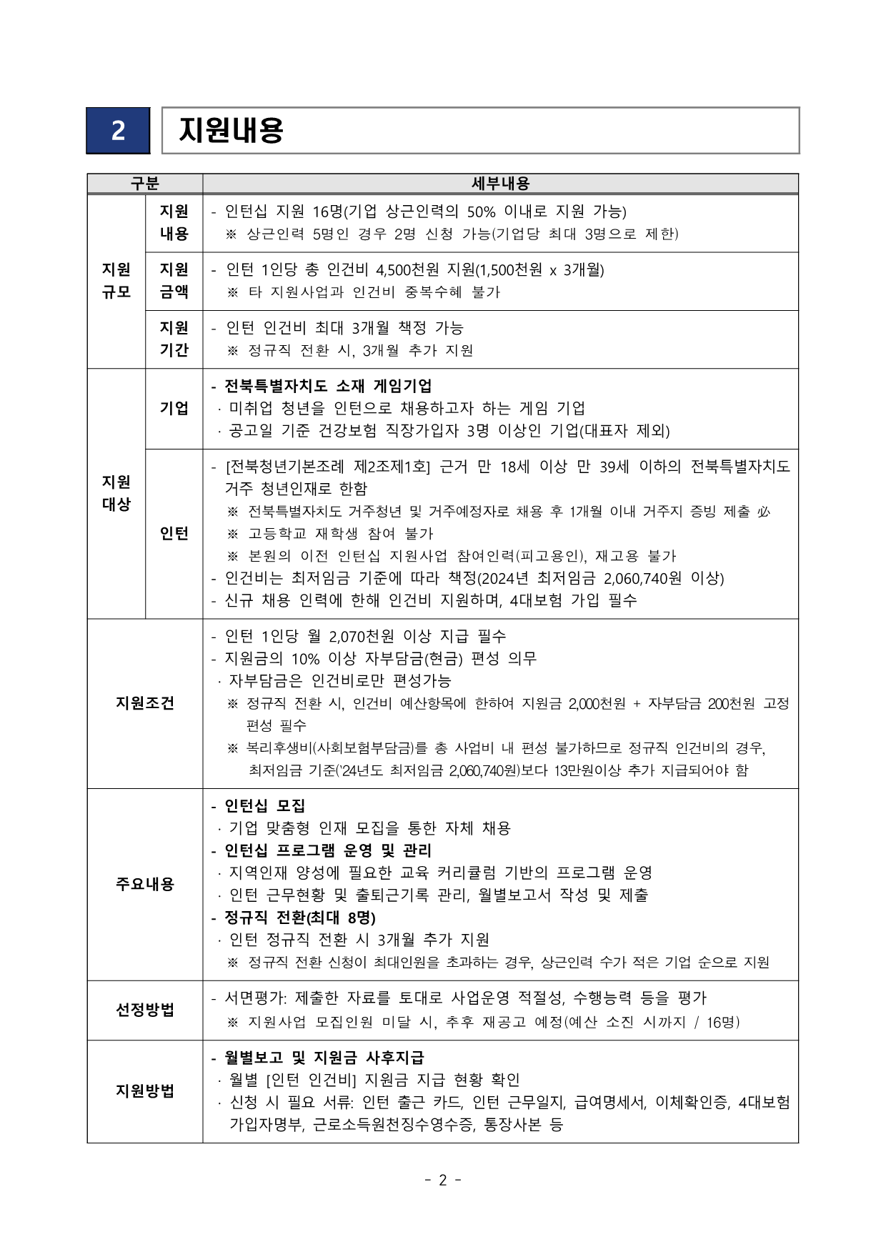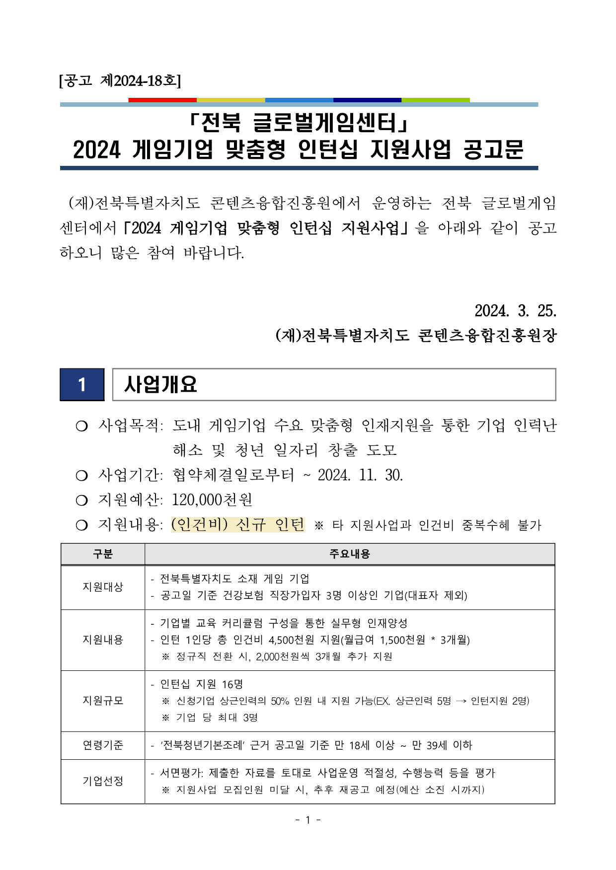 「2024 게임기업 맞춤형 인턴십 지원사업」을 붙임과 같이 공고하오니 많은 관심과 참여 부탁드립니다.