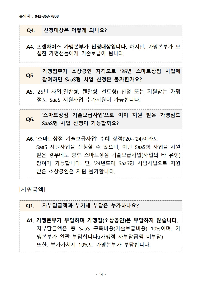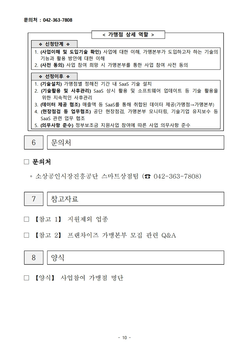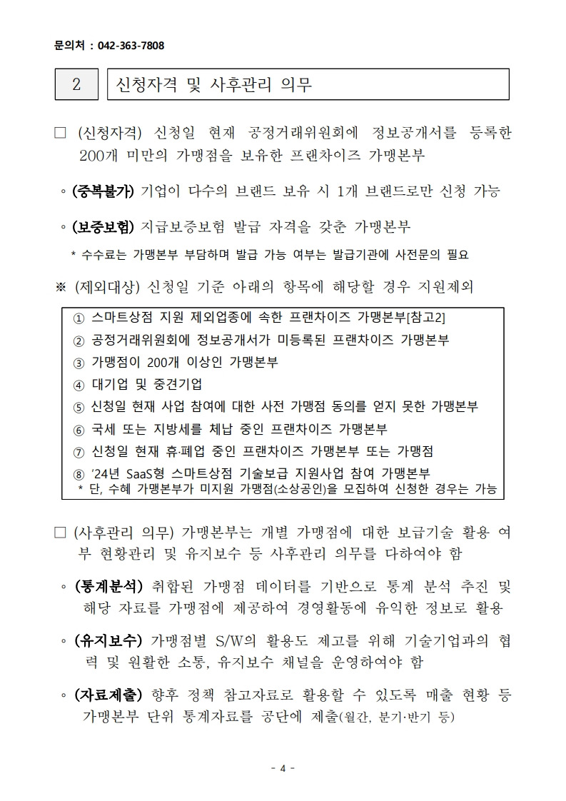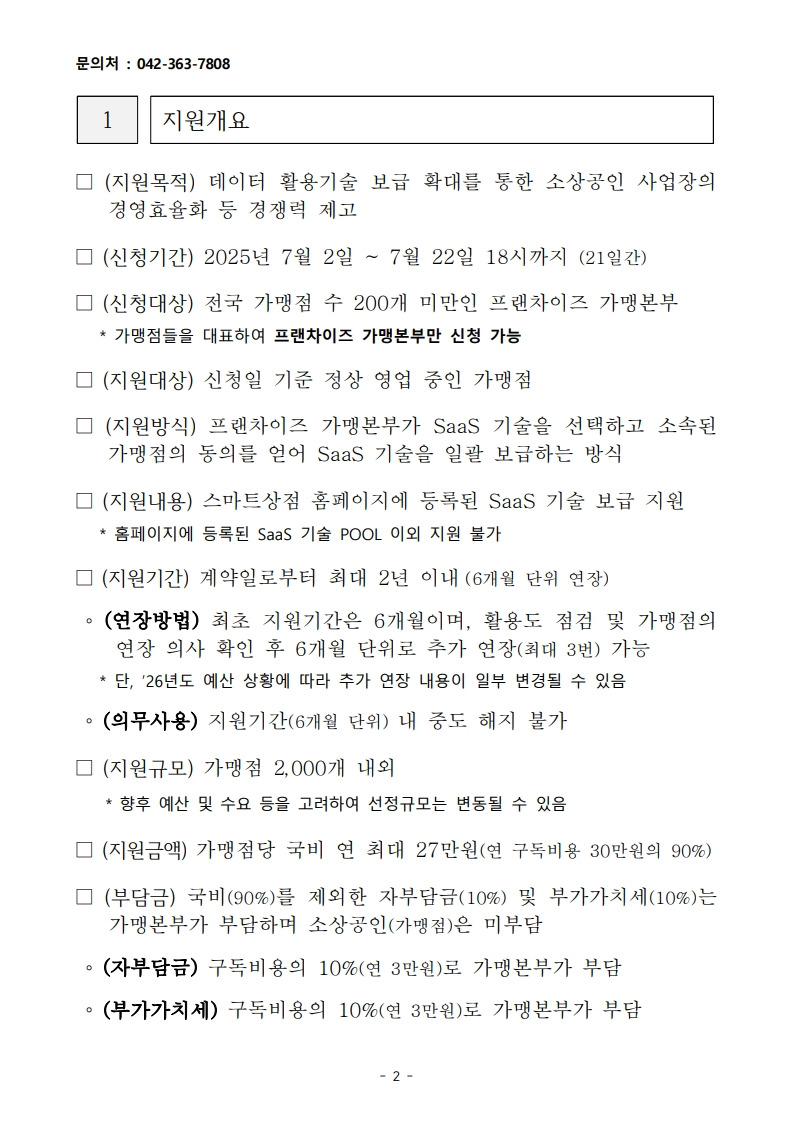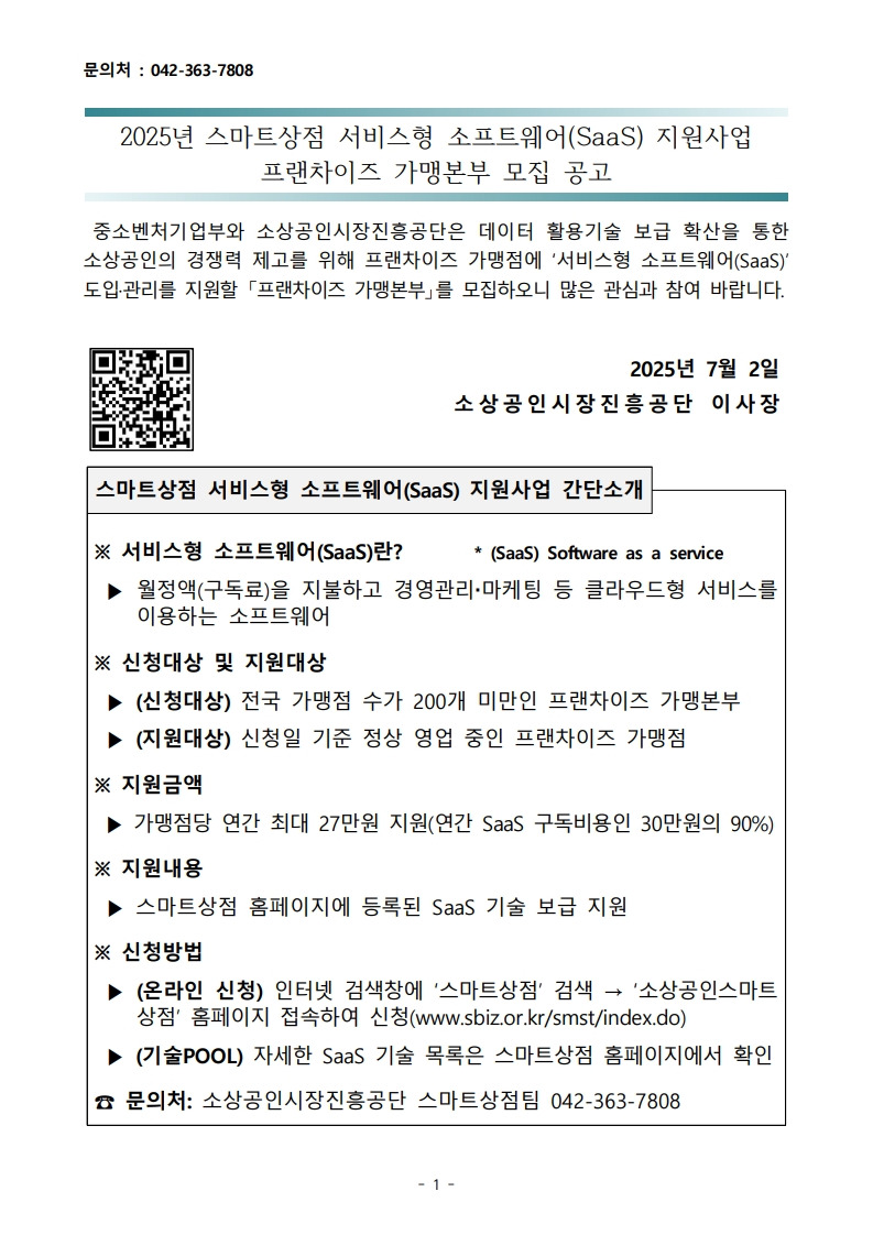 2025년 스마트상점 서비스형 소프트웨어(SaaS) 지원사업 프랜차이즈 가맹본부 모집 공고_소상공인시장진흥공단 작성자▥정실미▥|작성시간25.07.02|조회수9 목록 댓글 0 글자크기 작게가 글자크기 크게가 [양식]+2025년+스마트상점+기술보급사업+SaaS+프랜차이즈+가맹본부+참여+가맹점+명단.hwp33.50KB2025년+스마트상점+기술보급사업+SaaS+프랜차이즈+가맹본부+모집공고.pdf747.04KB 공모사업 바로가기https://goo.gl/forms/6U4SgcwlXWb836Qr2https://cafe.daum.net/policyfund/HhFz/774https://cafe.daum.net/policyfund/HhFz/344 첨부파일첨부된 파일이 20개 있습니다. jpg 파일 2025년+스마트상점+기술보급사업+SaaS+프랜차이즈+가맹본부+모집공고_2.jpg 다운로드 jpg 파일 2025년+스마트상점+기술보급사업+SaaS+프랜차이즈+가맹본부+모집공고_3.jpg 다운로드 jpg 파일 2025년+스마트상점+기술보급사업+SaaS+프랜차이즈+가맹본부+모집공고_4.jpg 다운로드 jpg 파일 2025년+스마트상점+기술보급사업+SaaS+프랜차이즈+가맹본부+모집공고_5.jpg 다운로드 jpg 파일 2025년+스마트상점+기술보급사업+SaaS+프랜차이즈+가맹본부+모집공고_7.jpg 다운로드 jpg 파일 2025년+스마트상점+기술보급사업+SaaS+프랜차이즈+가맹본부+모집공고_6.jpg 다운로드 jpg 파일 2025년+스마트상점+기술보급사업+SaaS+프랜차이즈+가맹본부+모집공고_1.jpg 다운로드 jpg 파일 2025년+스마트상점+기술보급사업+SaaS+프랜차이즈+가맹본부+모집공고_8.jpg 다운로드 jpg 파일 2025년+스마트상점+기술보급사업+SaaS+프랜차이즈+가맹본부+모집공고_9.jpg 다운로드 jpg 파일 2025년+스마트상점+기술보급사업+SaaS+프랜차이즈+가맹본부+모집공고_11.jpg 다운로드 jpg 파일 2025년+스마트상점+기술보급사업+SaaS+프랜차이즈+가맹본부+모집공고_12.jpg 다운로드 jpg 파일 2025년+스마트상점+기술보급사업+SaaS+프랜차이즈+가맹본부+모집공고_10.jpg 다운로드 jpg 파일 2025년+스마트상점+기술보급사업+SaaS+프랜차이즈+가맹본부+모집공고_13.jpg 다운로드 jpg 파일 2025년+스마트상점+기술보급사업+SaaS+프랜차이즈+가맹본부+모집공고_15.jpg 다운로드 jpg 파일 2025년+스마트상점+기술보급사업+SaaS+프랜차이즈+가맹본부+모집공고_17.jpg 다운로드 jpg 파일 2025년+스마트상점+기술보급사업+SaaS+프랜차이즈+가맹본부+모집공고_16.jpg 다운로드 jpg 파일 2025년+스마트상점+기술보급사업+SaaS+프랜차이즈+가맹본부+모집공고_14.jpg 다운로드 jpg 파일 2025년+스마트상점+기술보급사업+SaaS+프랜차이즈+가맹본부+모집공고_18.jpg 다운로드 hwp 파일 [양식]+2025년+스마트상점+기술보급사업+SaaS+프랜차이즈+가맹본부+참여+가맹점+명단.hwp 다운로드 pdf 파일 2025년+스마트상점+기술보급사업+SaaS+프랜차이즈+가맹본부+모집공고.pdf 다운로드 다음검색 현재 게시글 추가 기능 열기 북마크 공유하기 신고 센터로 신고 댓글 댓글 0 댓글쓰기 답글쓰기 댓글 리스트