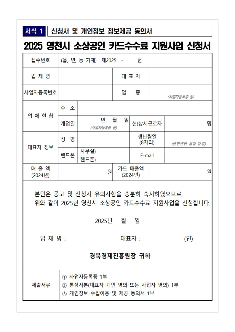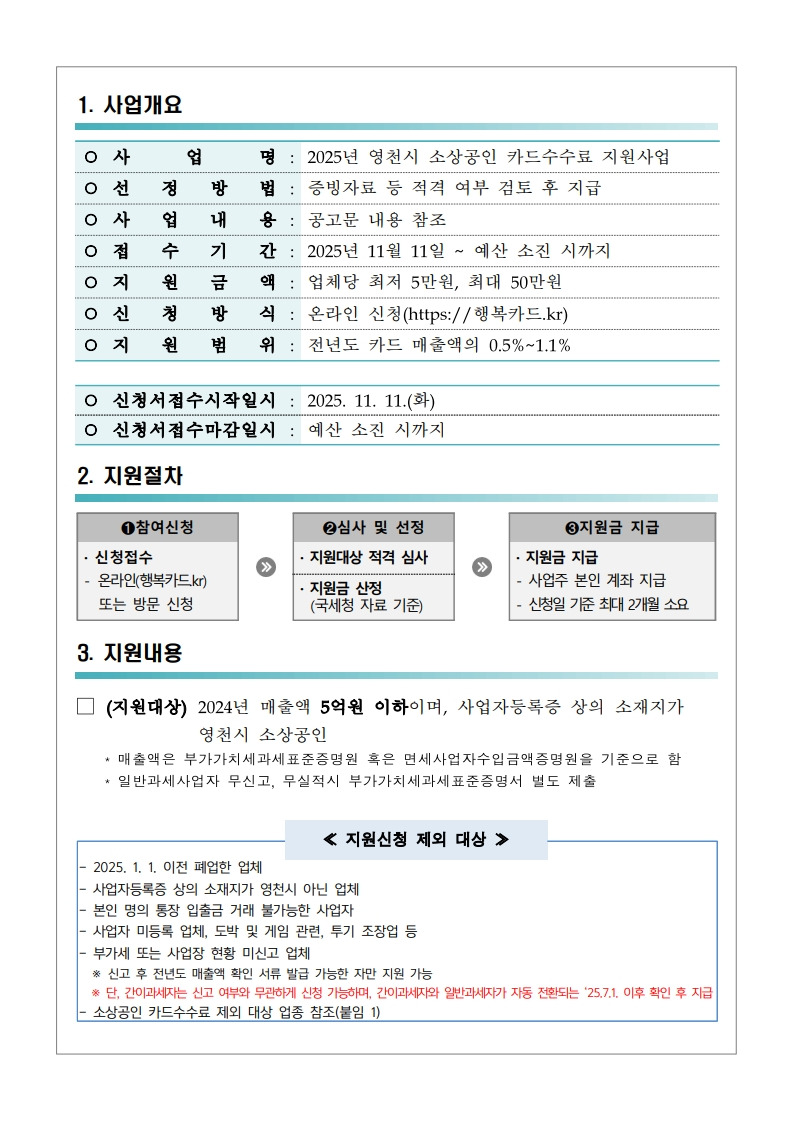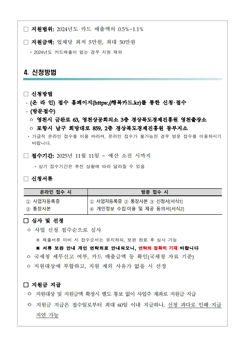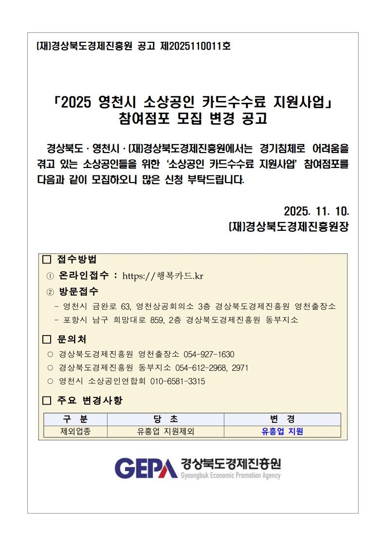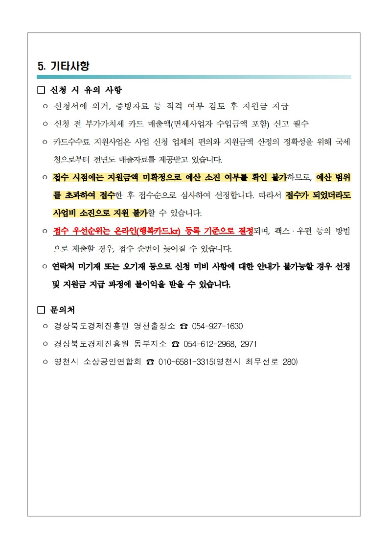 [경북] 영천시 2025년 소상공인 카드수수료 지원사업 참여점포 모집 변경 공고_경상북도경제진흥원 작성자▥정실미▥|작성시간25.11.12|조회수8 목록 댓글 0 글자크기 작게가 글자크기 크게가 붙임. 「2025년 영천시 소상공인 카드수수료 지원사업」모집 변경 공고.pdf386.74KB공모사업 바로가기https://goo.gl/forms/6U4SgcwlXWb836Qr2https://cafe.daum.net/policyfund/HhFz/786 https://cafe.daum.net/policyfund/HhFz/344 첨부파일첨부된 파일이 9개 있습니다. jpg 파일 붙임. 「2025년 영천시 소상공인 카드수수료 지원사업」모집 변경 공고_3.jpg 다운로드 jpg 파일 붙임. 「2025년 영천시 소상공인 카드수수료 지원사업」모집 변경 공고_6.jpg 다운로드 jpg 파일 붙임. 「2025년 영천시 소상공인 카드수수료 지원사업」모집 변경 공고_2.jpg 다운로드 jpg 파일 붙임. 「2025년 영천시 소상공인 카드수수료 지원사업」모집 변경 공고_1.jpg 다운로드 jpg 파일 붙임. 「2025년 영천시 소상공인 카드수수료 지원사업」모집 변경 공고_4.jpg 다운로드 jpg 파일 붙임. 「2025년 영천시 소상공인 카드수수료 지원사업」모집 변경 공고_5.jpg 다운로드 jpg 파일 붙임. 「2025년 영천시 소상공인 카드수수료 지원사업」모집 변경 공고_7.jpg 다운로드 jpg 파일 붙임. 「2025년 영천시 소상공인 카드수수료 지원사업」모집 변경 공고_8.jpg 다운로드 pdf 파일 붙임. 「2025년 영천시 소상공인 카드수수료 지원사업」모집 변경 공고.pdf 다운로드 다음검색 현재 게시글 추가 기능 열기 북마크 공유하기 신고 센터로 신고 댓글 댓글 0 댓글쓰기 답글쓰기 댓글 리스트