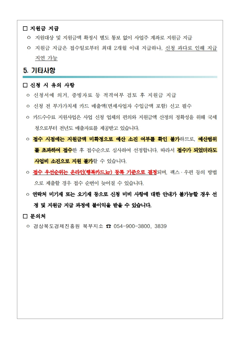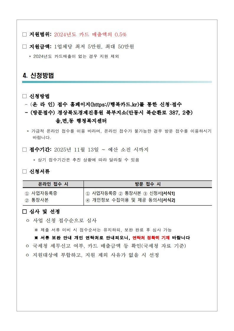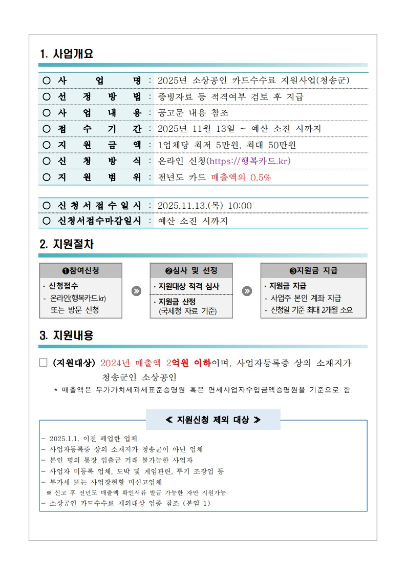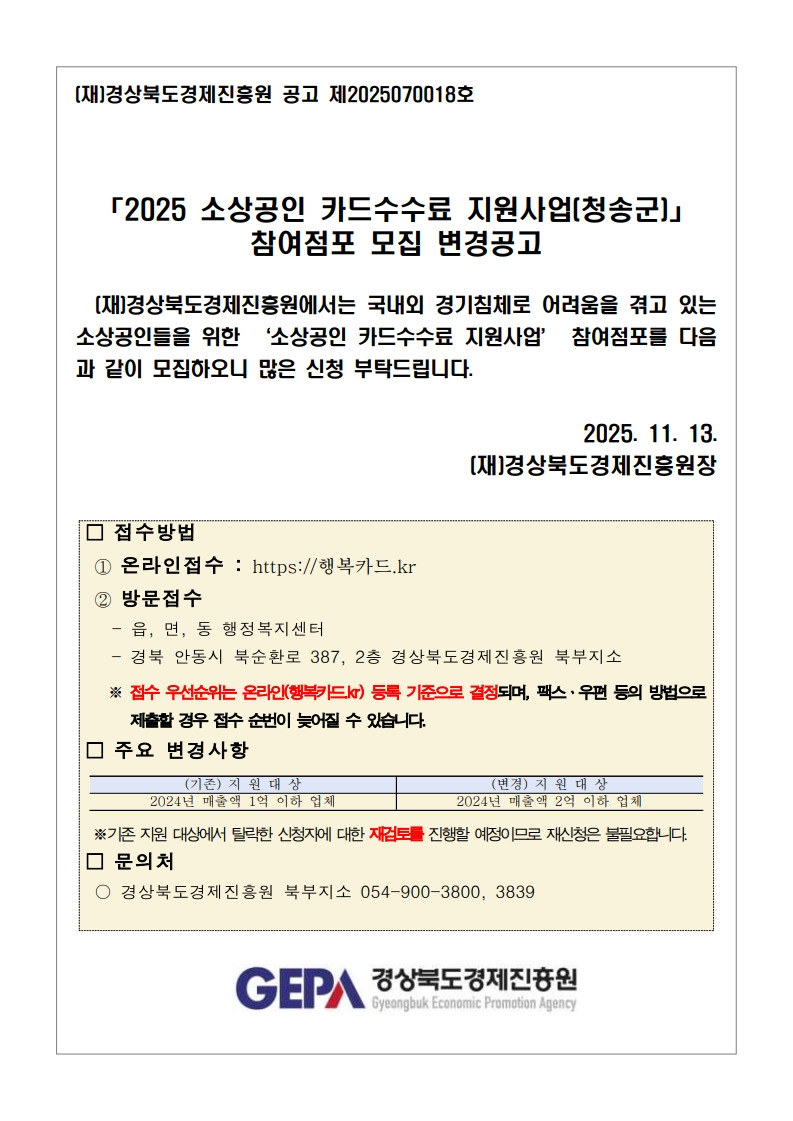 [경북] 청송군 2025년 소상공인 카드수수료 지원사업 참여점포 모집 변경 공고_경상북도경제진흥원 작성자▥정실미▥|작성시간25.11.14|조회수13 목록 댓글 0 글자크기 작게가 글자크기 크게가 (참고) 카드수수료 지원사업 신청접수 방법.pdf4.69MB(서식)신청서_ 개인정보 이용·수집·제공 동의서.hwp20.50KB2025년 청송군 소상공인 카드수수료 지원사업 모집공고.pdf320.13KB공모사업 바로가기https://goo.gl/forms/6U4SgcwlXWb836Qr2https://cafe.daum.net/policyfund/HhFz/772https://cafe.daum.net/policyfund/HhFz/344 첨부파일첨부된 파일이 9개 있습니다. jpg 파일 2025년 청송군 소상공인 카드수수료 지원사업 모집공고_1.jpg 다운로드 jpg 파일 2025년 청송군 소상공인 카드수수료 지원사업 모집공고_5.jpg 다운로드 jpg 파일 2025년 청송군 소상공인 카드수수료 지원사업 모집공고_3.jpg 다운로드 jpg 파일 2025년 청송군 소상공인 카드수수료 지원사업 모집공고_6.jpg 다운로드 jpg 파일 2025년 청송군 소상공인 카드수수료 지원사업 모집공고_4.jpg 다운로드 jpg 파일 2025년 청송군 소상공인 카드수수료 지원사업 모집공고_2.jpg 다운로드 hwp 파일 (서식)신청서_ 개인정보 이용·수집·제공 동의서.hwp 다운로드 pdf 파일 2025년 청송군 소상공인 카드수수료 지원사업 모집공고.pdf 다운로드 pdf 파일 (참고) 카드수수료 지원사업 신청접수 방법.pdf 다운로드 다음검색 현재 게시글 추가 기능 열기 북마크 공유하기 신고 센터로 신고 댓글 댓글 0 댓글쓰기 답글쓰기 댓글 리스트