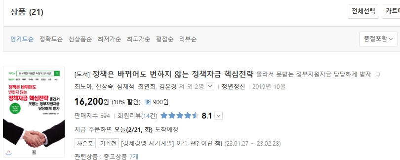 아래는 2023년 2월 21일 기준, 국내 3대 대형서점의 정책자금 분야 인기(판매량) 순위입니다.