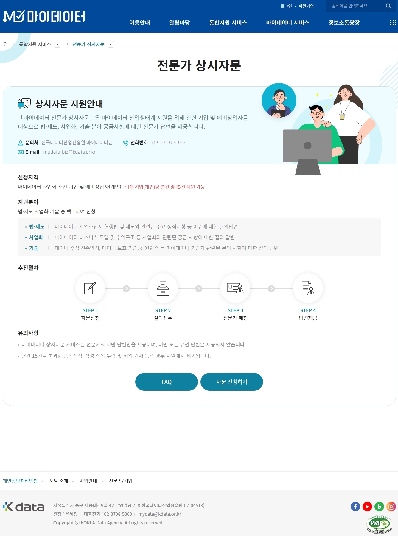 「마이데이터 전문가 상시자문」은 마이데이터 산업생태계 지원을 위해 관련 기업 및 예비창업자를 대상으로 법·제도, 사업화, 기술 분야 궁금사항에 대한 전문가 답변을 제공합니다.