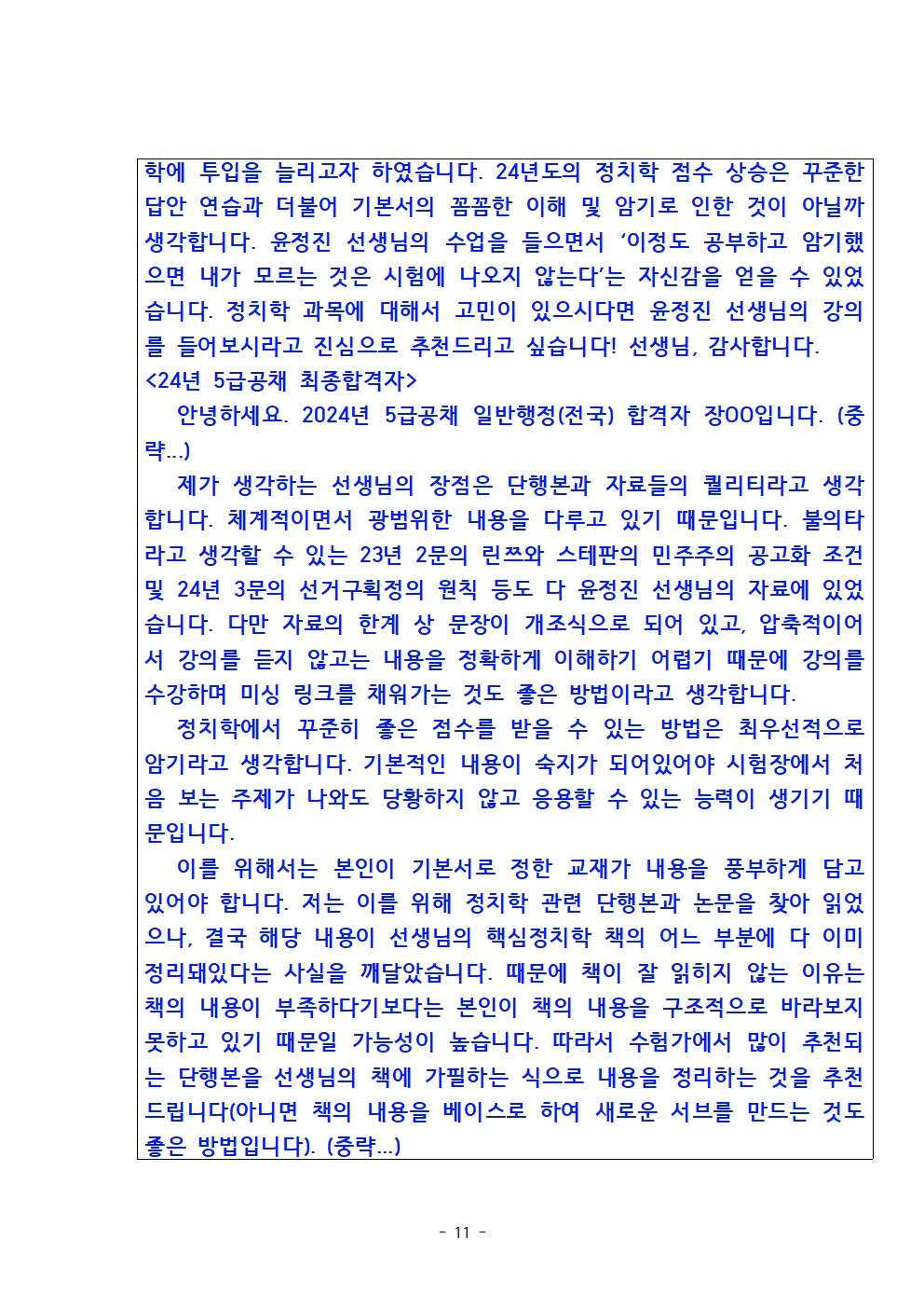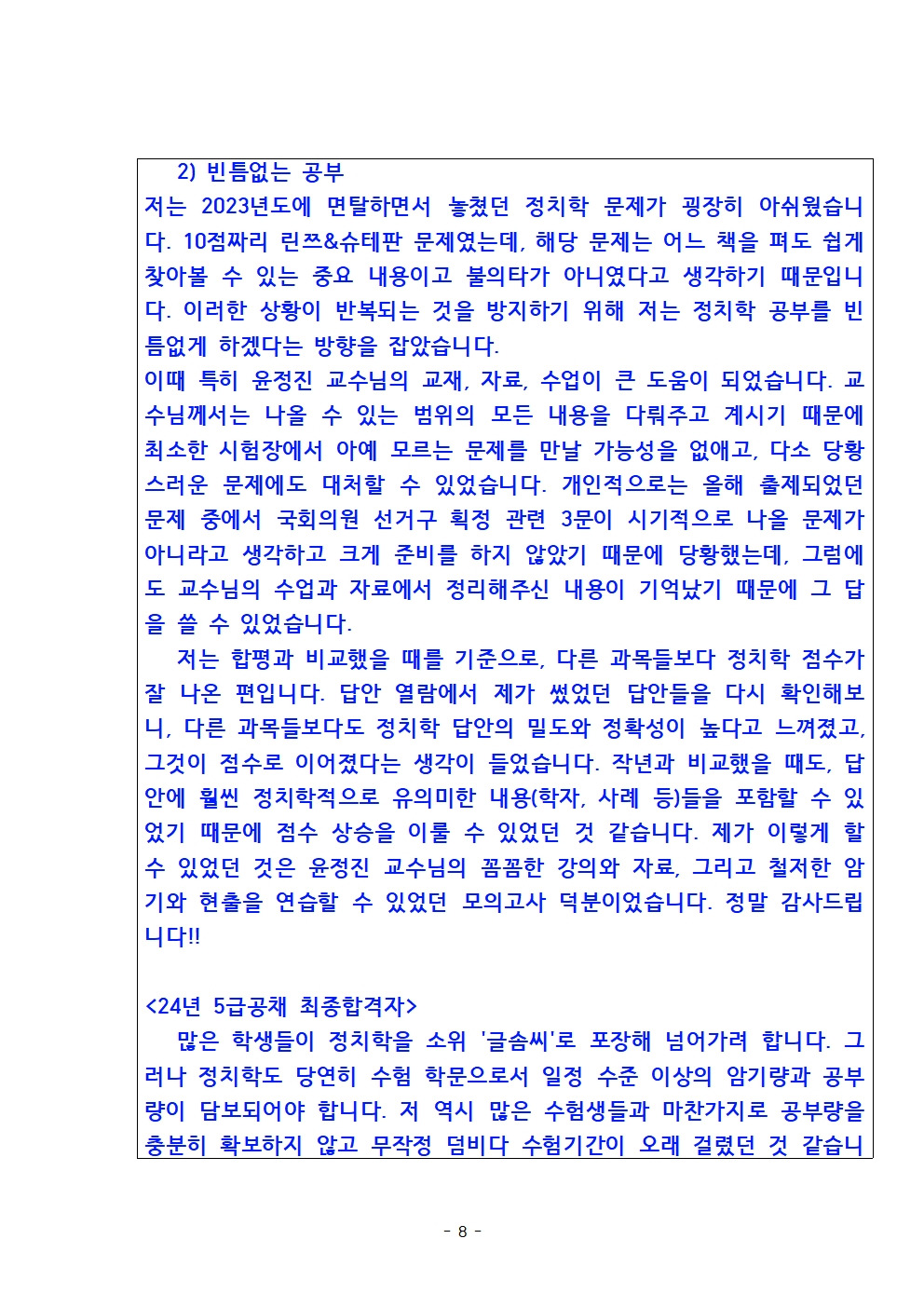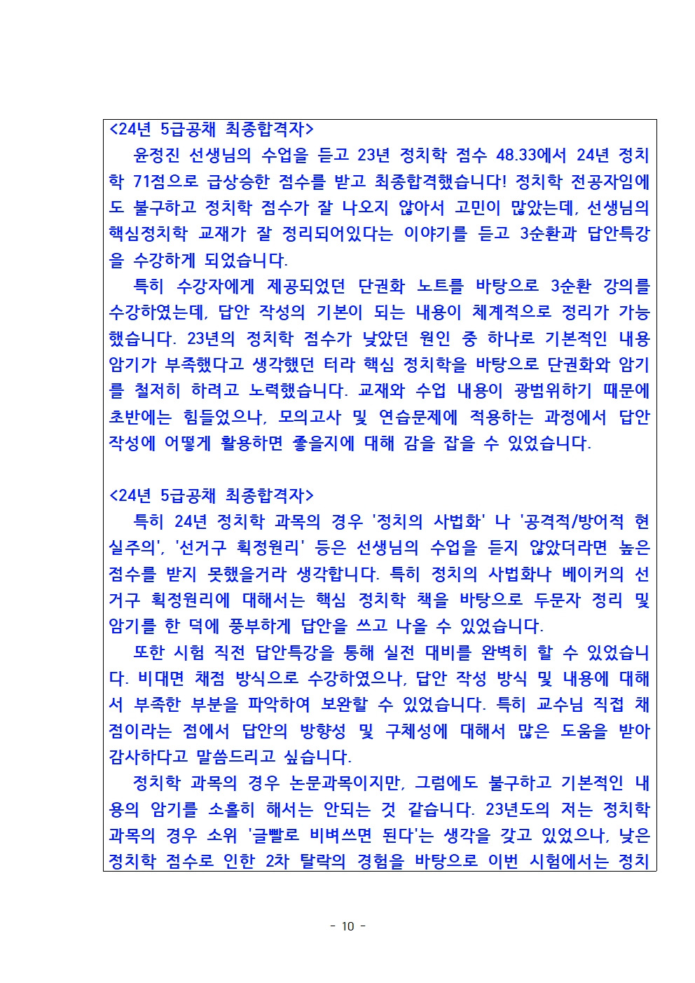 핵심 정치학 수강 후 5급공채 23년 최종합격지들 중 정치학 전체수석 및 24년 최종합격자들 중 정치학 우수성적의 수강소감입니다~