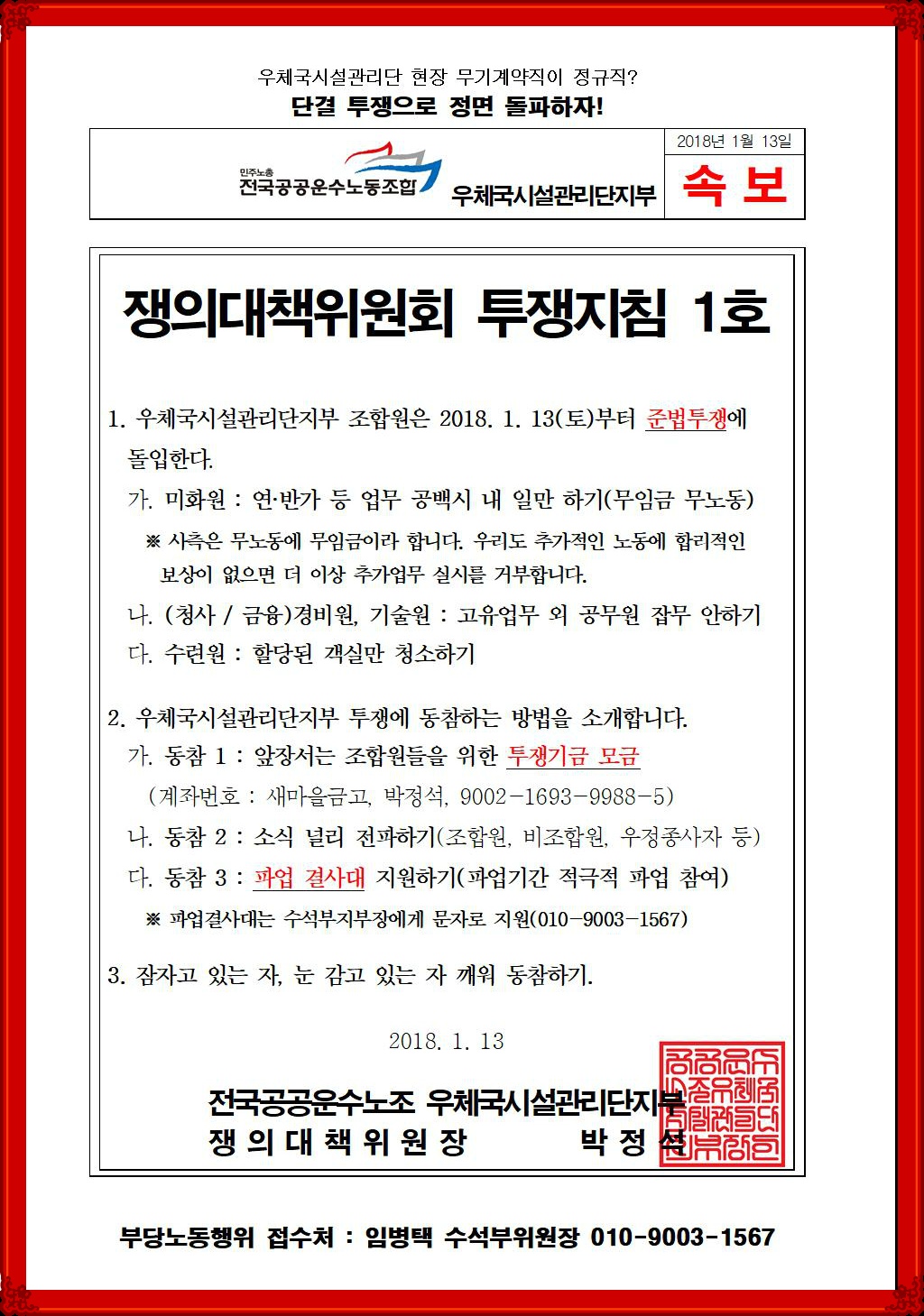 <투쟁지침 1호> 쟁의대책위원회 준법투쟁 지침 지시 작성자우체국시설관리단지부|작성시간18.01.13|조회수1,211 목록 댓글 0 글자크기 작게가 글자크기 크게가 다음검색 현재 게시글 추가 기능 열기 북마크 공유하기 신고 센터로 신고 댓글 댓글 0 댓글쓰기 답글쓰기 댓글 리스트