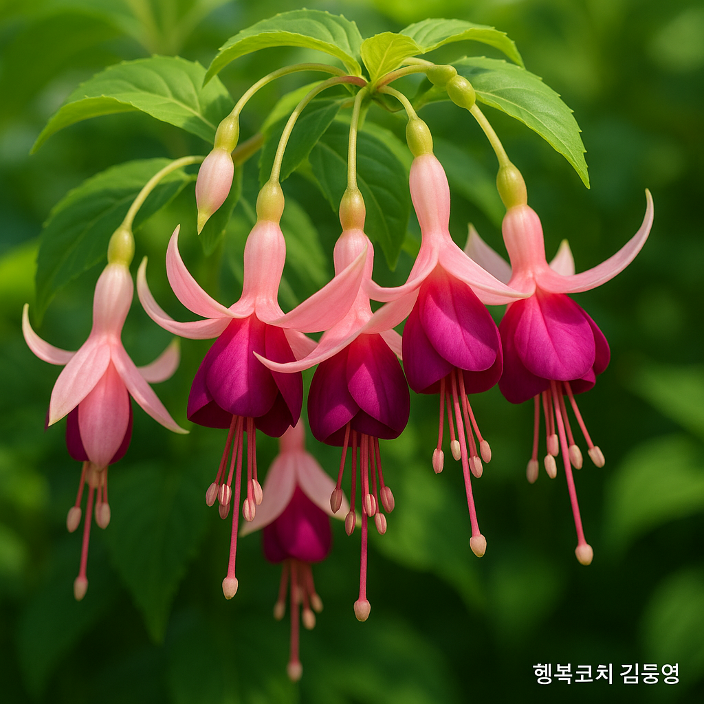 밝은 연두색 잎사귀들 사이에 늘어지듯 피어난 귀고리꽃(Fuchsia)을 실사 스타일로 정밀하게 그려주세요. 꽃은 위쪽에 연한 분홍빛 꽃받침이 있고, 아래쪽으로 진한 자주색 꽃잎이 귀고리처럼 늘어집니다. 꽃잎 끝에는 길게 늘어진 수술과 흰색 꽃밥이 섬세하게 표현되어야 하며, 여러 송이가 다발로 모여 풍성하게 피어 있어야 합니다. 배경은 자연 녹음이 느껴지는 초록 식물들로 채워주시고, 꽃의 생생한 광택과 윤기를 강조해주세요. 전체적으로 햇빛 아래 빛나는 느낌을 살리며, 화면 오른쪽 아래에 “행복코치 김동영”이라는 텍스트를 세련되게 삽입해주세요.