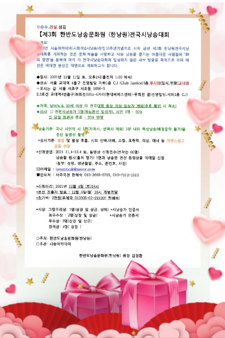제3회 '한낭원'전국시낭송대회 작성자송뢰 김정환|작성시간21.11.08|조회수20 목록 댓글 0 글자크기 작게가 글자크기 크게가 다음검색 현재 게시글 추가 기능 열기 북마크 공유하기 신고 센터로 신고 댓글 댓글 0 댓글쓰기 답글쓰기 댓글 리스트