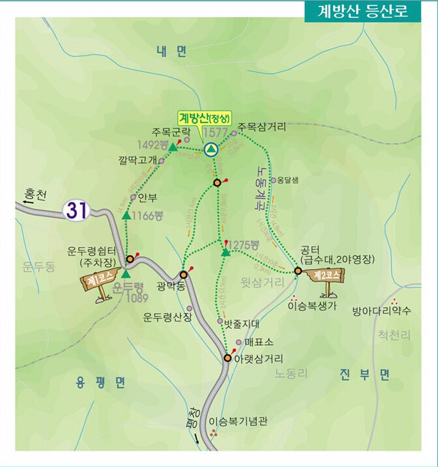 산행은 운두령에서 시작하여 노동리 삼거리나 척천리 방아다리 약수로 하산하는 것이