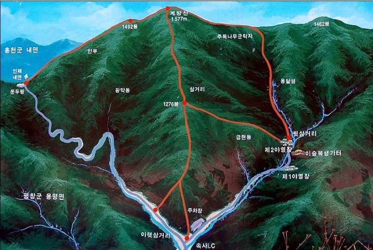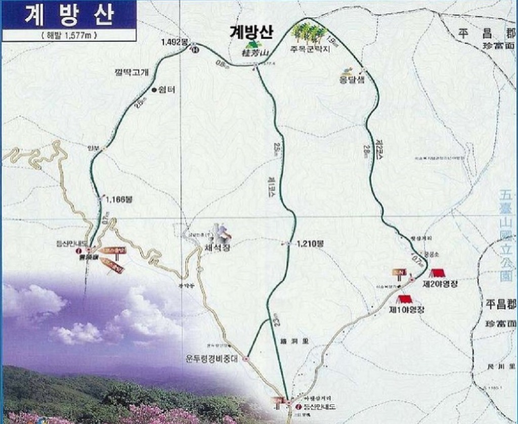▶운두령 -(20분)- 1,166봉 -(15분)- 건막교 갈림길 -(30분)- 1,492봉 -(40분, 주목군락, 헬기장)- 정상 -(1시간30분)- 이승복 생가터 -(1시간30분)-야영장 (5시간 정도)
