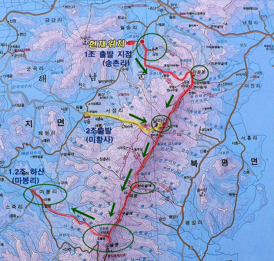 [송촌마을 기점 코스] 동부도- 미황사 (약11.5km) : 4시간 ▷송촌-관음봉-바람재-농바우재-426봉-465봉-달마산(불성봉)-문바위재-사자봉- 472봉-임걸재-장춘마을(버스이동)-미황사(9Km 5시간 30분)