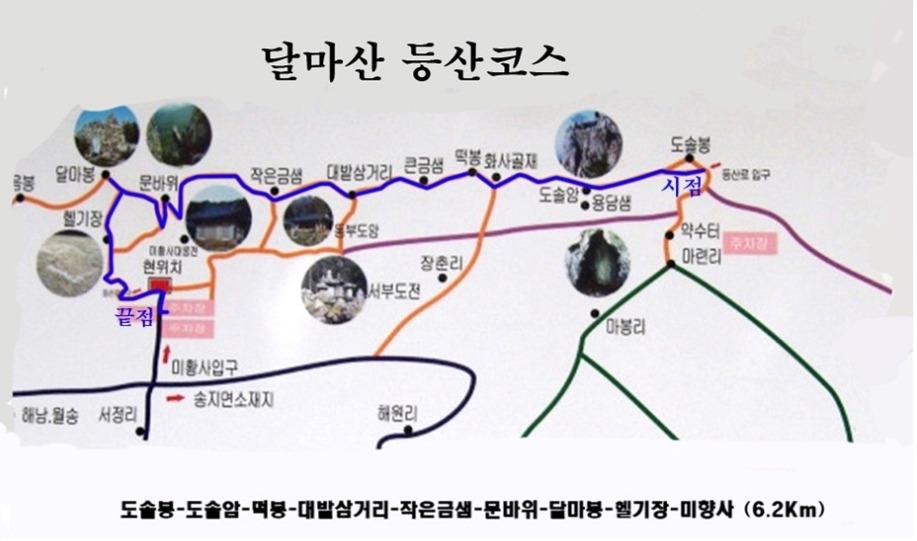 ◎초보 산행객은 미황사 - 달마봉 - 문바위 - 미항사(2시간 내외) 또는 미황사 - 수도암 – 작은금샘 - 문바위 - 달마봉 - 미황사(또는 역순)의 2~3시간 코스가 좋다. |