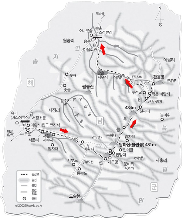 ▶ 월송리(송촌마을) - 안부 - 관음봉 - 불썬봉 - 달마산 - 떡봉 - 도솔봉