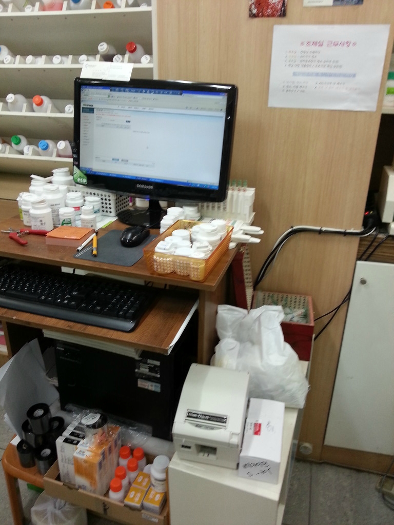 이 공간 뒤가 조제실인데 조제실에 기존에 사용하던 컴퓨터가 있습니다. 이 컴퓨터에 라벨프린터와 조제용 모니터를 설치하였습니다.