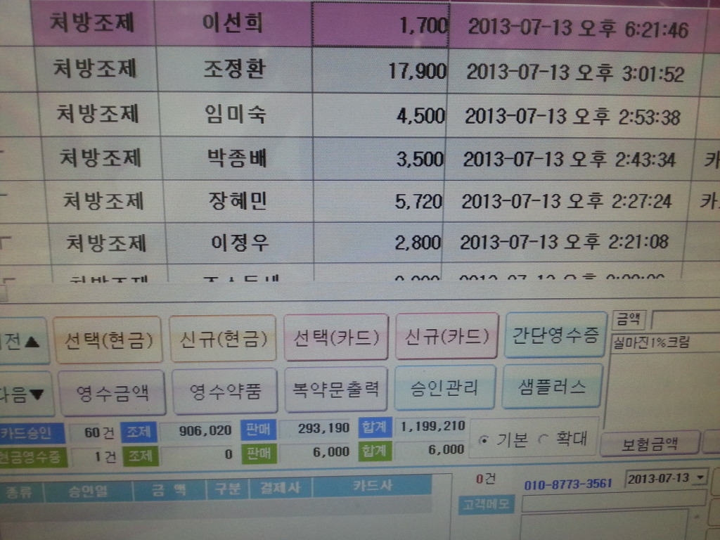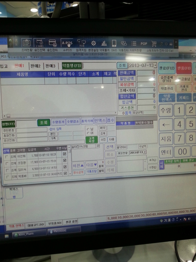 상하모니터에서 아래화면에 POS화면을 띄워놓은 것입니다, 약품등록은 비교적 간단하였습니다.