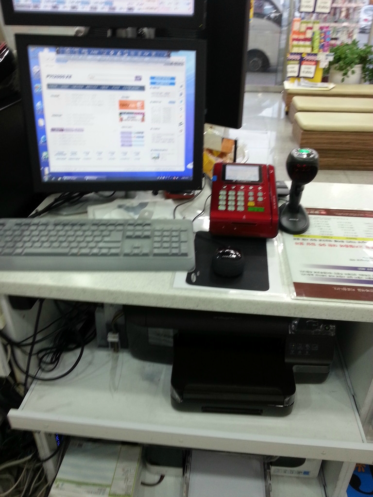 매대아래에 2대의 프린터가 보입니다. 윗쪽 프린터는 팜페이에서 제작한 팜봉투를 넣어 놓았습니다.