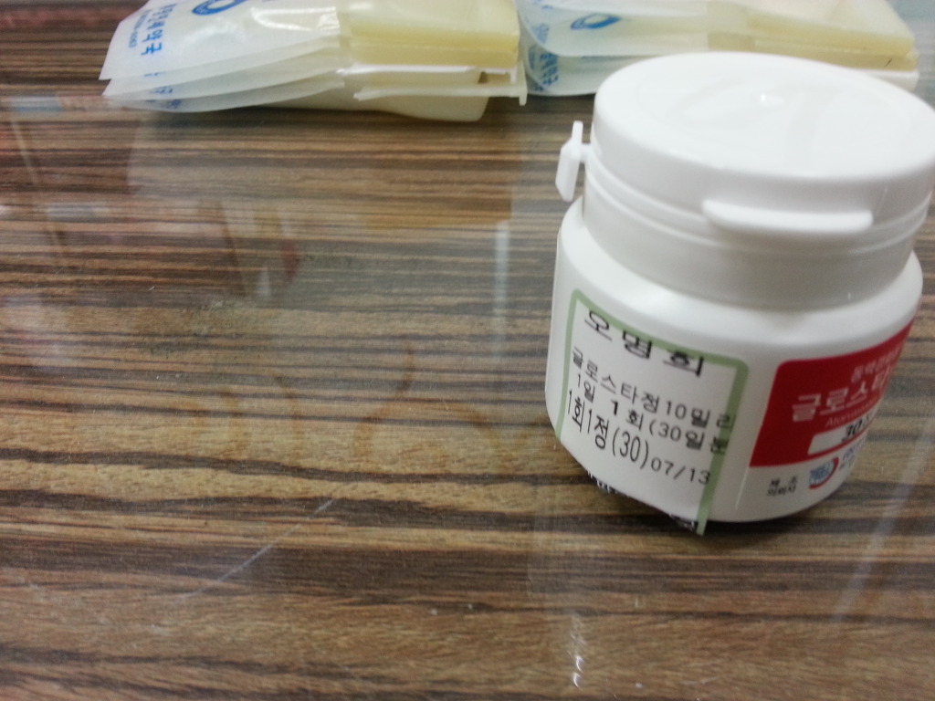 혈압약이나 고지혈증약중에서 통단위로 나가는 경우에는 조제실 모니터에서 해당 약품을 두번 터치하면 그 약품에 대해 라벨이 나옵니다. 위에 고지혈증약에 대한 라벨이 붙어 있습니다.
