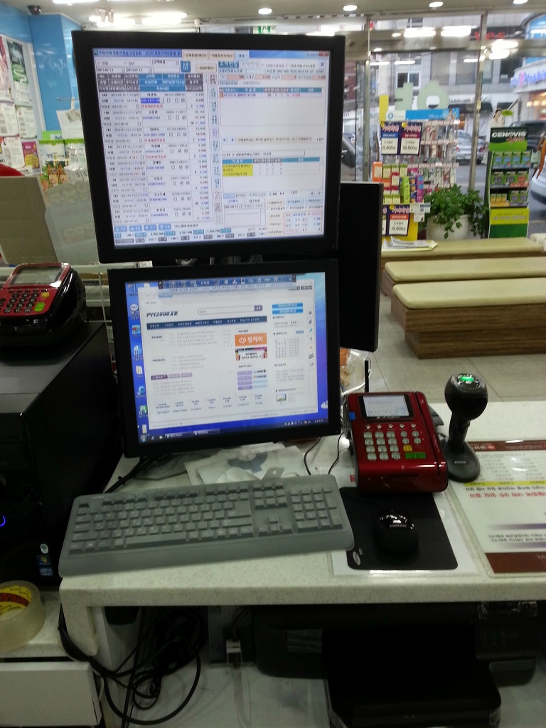 상하모니터밑으로 팜봉투출력을 위한 프린터가 있고 그 아래에 또 A4용지로 뽑을 수 있는 프린터가 있습니다.
