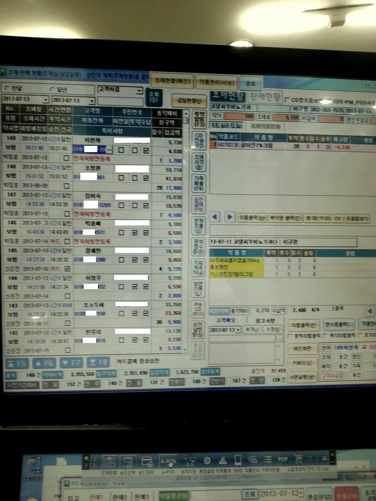 상하모니터중에 위에 모니터에는 주로 고객의 조제판매현황을 띄워 사용합니다. 아래화면은 POS를 하기위해 띄웁니다.