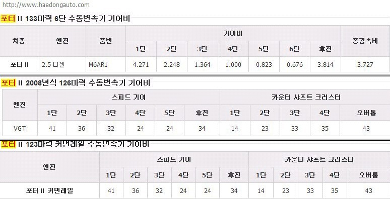 작성자[회장]탱크포터(李源海) 작성시간 14.03.25 기어비는 같으나 종감속이 다르죠..... 08년이전모델 4.2/3.909/3.615 ^^ 그리고 포터는 vgt 없습니다 전모델04~14년까지 전부 wgt입니다....