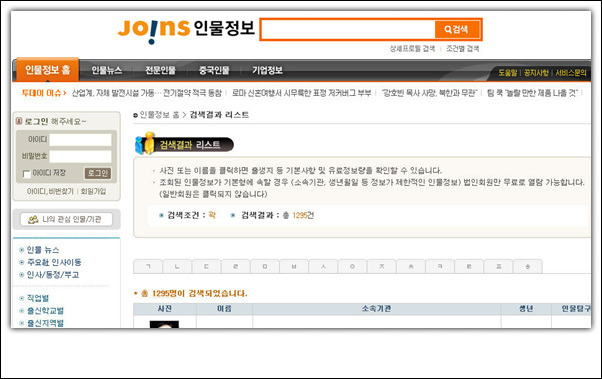 - 1985년 국내 최초로 인물정보 데이터베이스 구축을 시작한 이래 성장과 혁신을 거듭해 온 조인스 인물정보는 30만 여명의 대한민국 각 분야 주요 인사들의 프로필 정보를 보유하고 있으며, 다양한 검색과 디렉토리 서비스를 통해 사회와 공유하고 있습니다.
