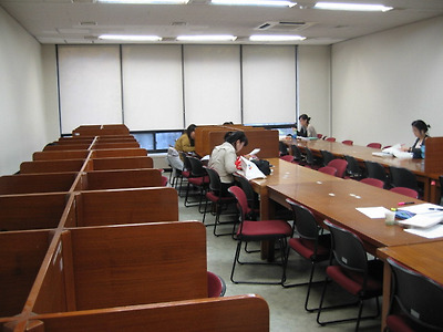 도서관 열람실. 의자가 상당히 편안한 의자이다. 학업에 열중하는 검은옷을 입은 여대생이 인상적이다.