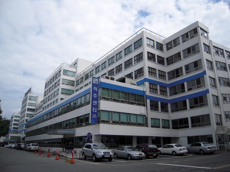 치과병원과 치과대학이 쌍둥이처럼 나란히 위치하고 있고 뒤쪽으로 치전원이 있다