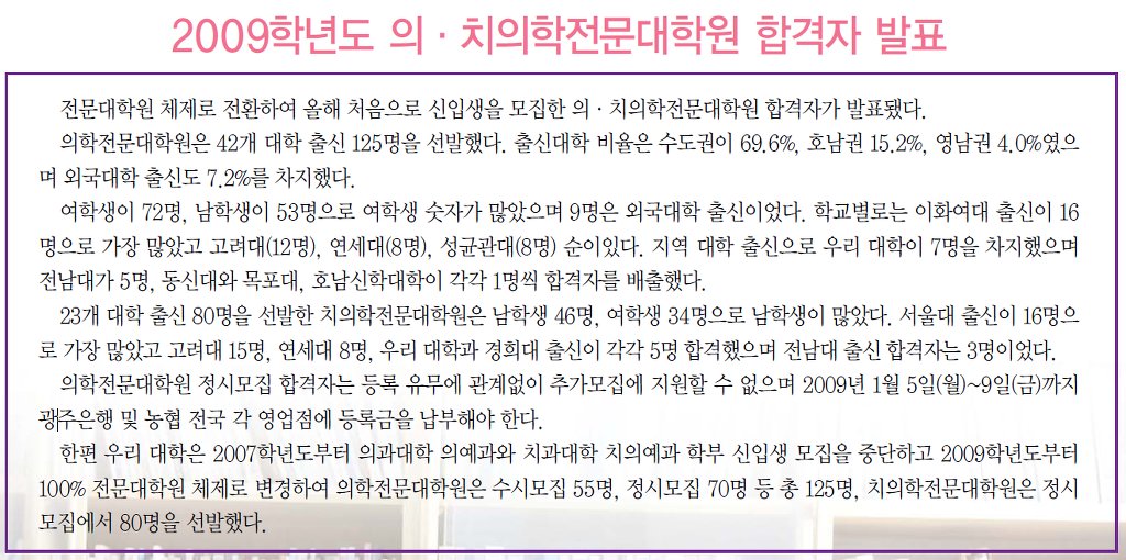 조대 의전 - 이화여 16 / 고려대 12 / 연세대 8 / 성균관 8 / 전남대 5 / 동신대 1 / 목포대 1 / 호남신학대 1