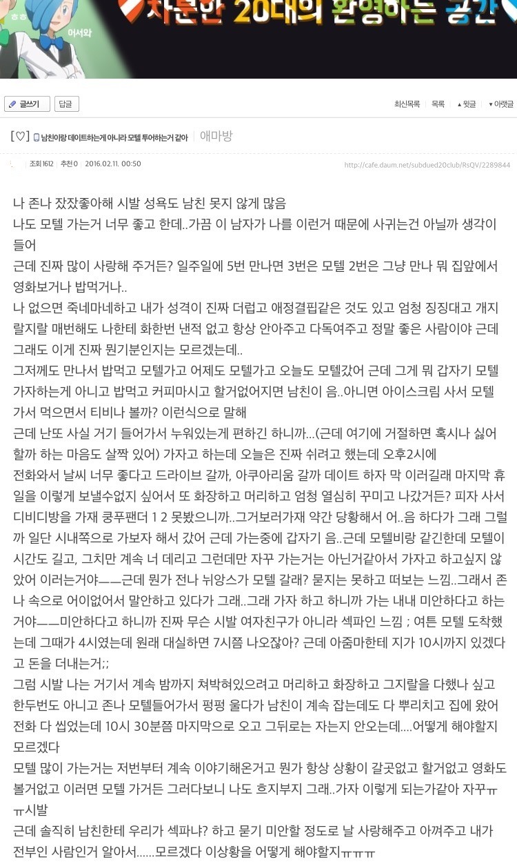 [스크랩] 남친이랑 데이트 하는게 아니라 모텔투어 하는거같아 작성자infinityp|작성시간16.02.13|조회수1,799 목록 댓글 13 글자크기 작게가 글자크기 크게가 다음검색 스크랩 원문 : 이종격투기 현재 게시글 추가 기능 열기 북마크 공유하기 신고 센터로 신고 댓글 댓글 13 댓글쓰기 답글쓰기 댓글 리스트 작성자nuts | 작성시간 16.02.13 니가 어디 가자고 해봐라 이년아 작성자nuts | 작성시간 16.02.13 섹스가 좋긴좋다 해도 안질리고 답댓글 작성자HSBC | 작성시간 16.02.14 아재 ㅠㅠ 작성자메갈베의 착한남혐 | 작성시간 16.02.13 갈봐 작성자네드베드 | 작성시간 16.02.13 저것도 연애초나 저러지어느샌가 뒤바뀐다... 댓글 전체보기