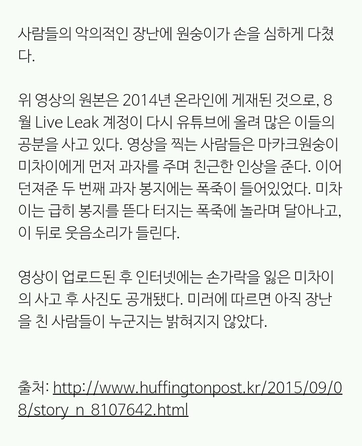 [혐오] 인간의 장난에 손가락 잃은 원숭이 (개빡침) 작성자spare|작성시간16.07.04|조회수604 목록 댓글 1 글자크기 작게가 글자크기 크게가 . 다음검색 현재 게시글 추가 기능 열기 북마크 공유하기 신고 센터로 신고 댓글 댓글 1 댓글쓰기 답글쓰기 댓글 리스트 작성자우주론 | 작성시간 16.07.04 똑같이 해줘라. 댓글 전체보기