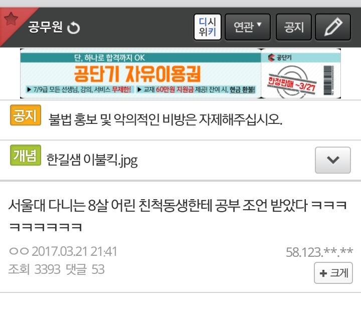 실시간 공무원갤러리.jpg 작성자생각대로T|작성시간17.03.22|조회수1,095 목록 댓글 3 글자크기 작게가 글자크기 크게가 퍄... 다음검색 현재 게시글 추가 기능 열기 북마크 공유하기 신고 센터로 신고 댓글 댓글 3 댓글쓰기 답글쓰기 댓글 리스트 작성자내남돌2 | 작성시간 17.03.22 ㅉㄸ 작성자경상북도 김천시 | 작성시간 17.03.22 지균이나 수시충이면 때려죽여라 답댓글 작성자잘하고있는건가 | 작성시간 17.03.22 22222222 댓글 전체보기