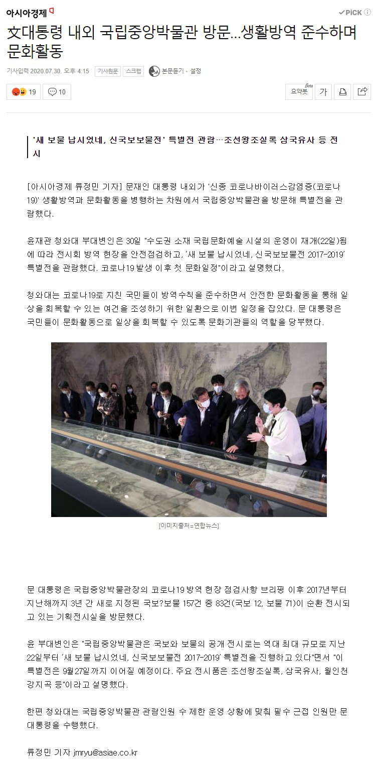 文대통령 내외 국립중앙박물관 방문…생활방역 준수하며 문화활동