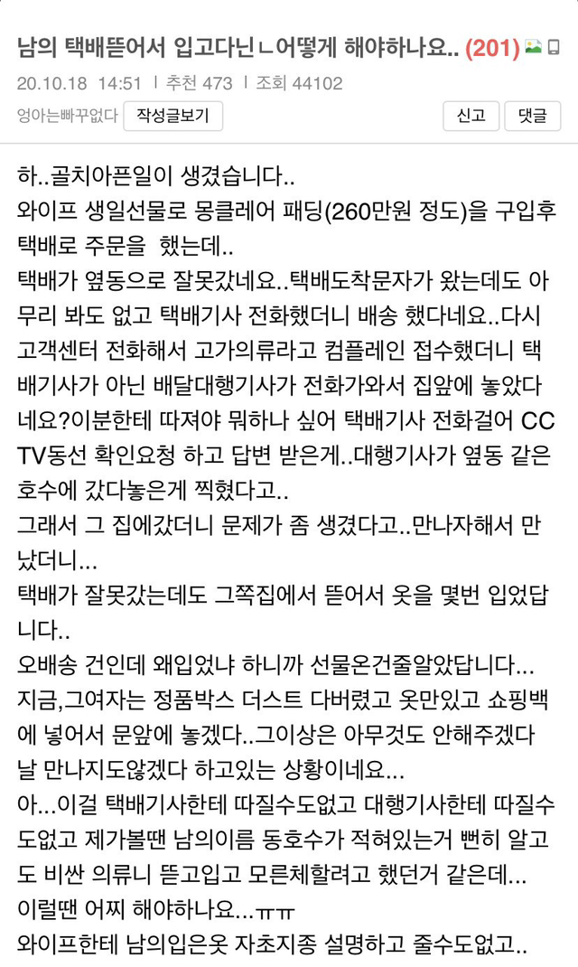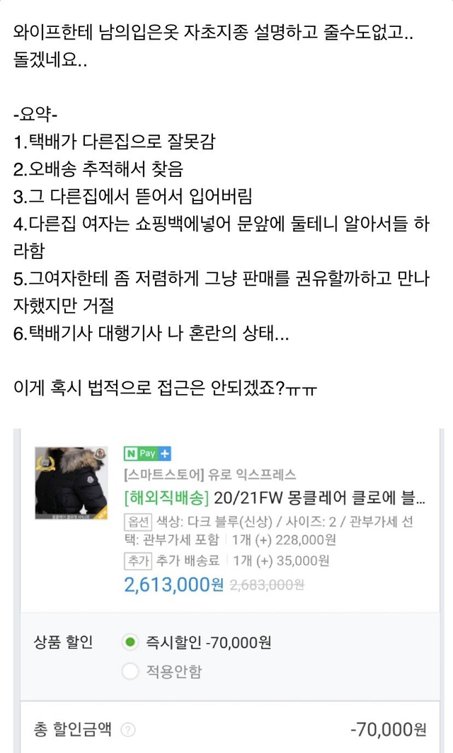 [스크랩] 남의 택배 뜯어서 입고 다닌 ㄴ 어떻게 해야 하나요? 작성자[지옥]이온성액체|작성시간20.10.19|조회수483 목록 댓글 11 글자크기 작게가 글자크기 크게가 . 다음검색 스크랩 원문 : 도탁스 (DOTAX) 현재 게시글 추가 기능 열기 북마크 공유하기 신고 센터로 신고 댓글 댓글 11 댓글쓰기 답글쓰기 댓글 리스트 작성자김페퍼 | 작성시간 20.10.19 점유이탈물횡령임 삭제된 댓글입니다. 답댓글 작성자드디어탈출 | 작성시간 20.10.19 잘못 송금된 돈 쓰면 횡령죄 작성자Ralph-Lauren | 작성시간 20.10.19 이건 점탈 작성자고승덕 | 작성시간 20.10.19 걍 판매자 통해서 해결하는게 좋을듯 판매자는 배송사에 배상요구하고 댓글 전체보기
