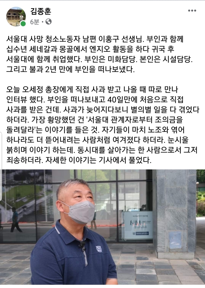 [스크랩] 서울대 청소 노동자 사망사건 뒷얘기 작성자이드|작성시간21.08.05|조회수407 목록 댓글 0 글자크기 작게가 글자크기 크게가 https://www.facebook.com/100001480386394/posts/4331939220198715/로그인 또는 가입하여 보기Facebook에서 게시물, 사진 등을 확인하세요.www.facebook.com 다음검색 스크랩 원문 : THIS IS TOTAL WAR 현재 게시글 추가 기능 열기 북마크 공유하기 신고 센터로 신고 댓글 댓글 0 댓글쓰기 답글쓰기 댓글 리스트