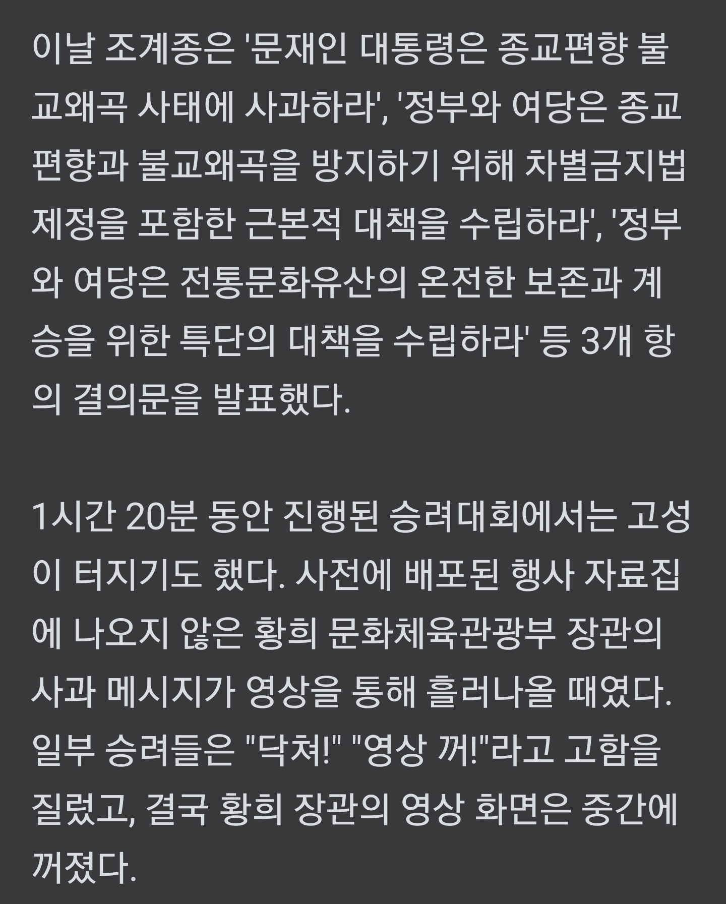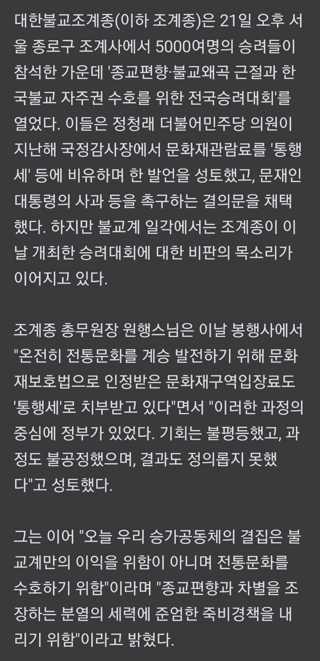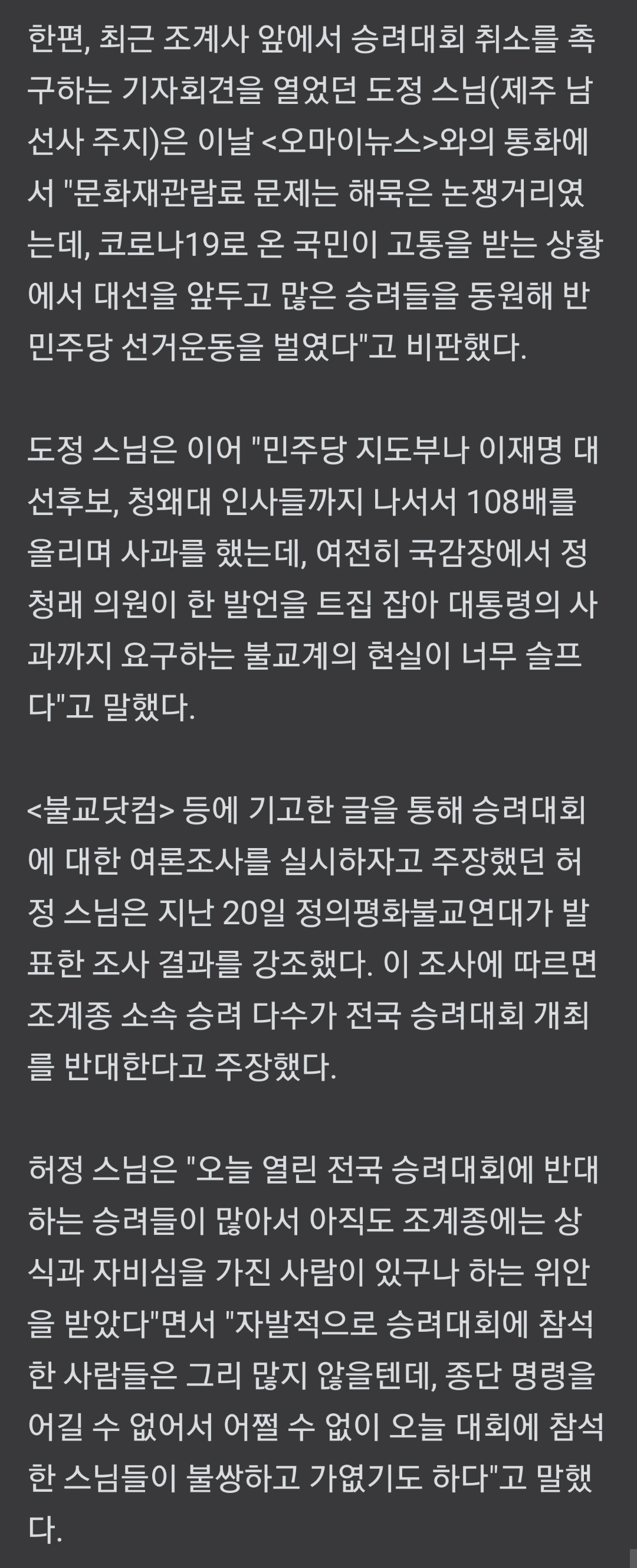 [스크랩] 승려대회서 "대통령 사과" 촉구... 대선 앞둔 "정치쇼" 비판도 작성자뱅모|작성시간22.01.21|조회수295 목록 댓글 1 글자크기 작게가 글자크기 크게가 https://n.news.naver.com/article/047/0002339863승려대회서 "대통령 사과" 촉구... 대선 앞둔 "정치쇼" 비판도21일 조계사 앞마당서 진행, 5000여명 참석... 정청래 의원 재차 사과, 송영길 대표 '사과 발언' 무산 ▲ 21일 오후 서울 종로구 조계사에서 '종교편향·불교왜곡 근절과 한국불교 자주권 수호를 위n.news.naver.com중략,중략 다음검색 스크랩 원문 : 樂soccer 현재 게시글 추가 기능 열기 북마크 공유하기 신고 센터로 신고 댓글 댓글 1 댓글쓰기 답글쓰기 댓글 리스트 작성자[지옥][지옥]이온성액체[지옥] | 작성시간 22.01.21 아따 빨간물들은 사제단은 당연한거제잉 댓글 전체보기
