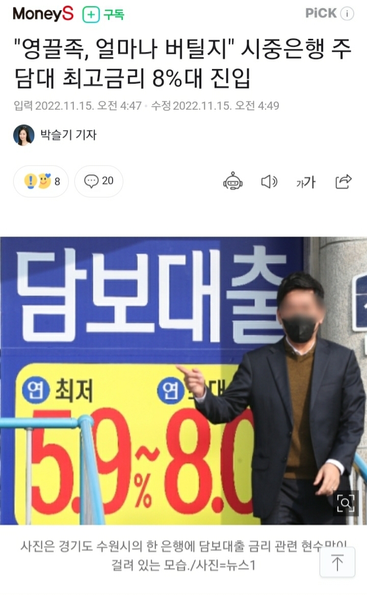 "영끌족, 얼마나 버틸지" 시중은행 주담대 최고금리 8%대 진입 작성자Häagen Dazs|작성시간22.11.15|조회수328 목록 댓글 2 글자크기 작게가 글자크기 크게가 https://n.news.naver.com/mnews/article/417/0000869206?sid=101"영끌족, 얼마나 버틸지" 시중은행 주담대 최고금리 8%대 진입시중은행 주택담보대출 최고금리가 8% 선을 뚫었다. 주택담보대출의 준거 금리인 은행채 금리가 5%를 훌쩍 넘어선 영향이다. 15일 은행권에 따르면 하나은행의 변동형 주택담보대출 금리는 전날 n.news.naver.com 다음검색 현재 게시글 추가 기능 열기 북마크 공유하기 신고 센터로 신고 댓글 댓글 2 댓글쓰기 답글쓰기 댓글 리스트 삭제된 댓글입니다. 답댓글 작성자posthoolis | 작성시간 22.11.15 고연봉 훌들은 대상이 안댐 댓글 전체보기