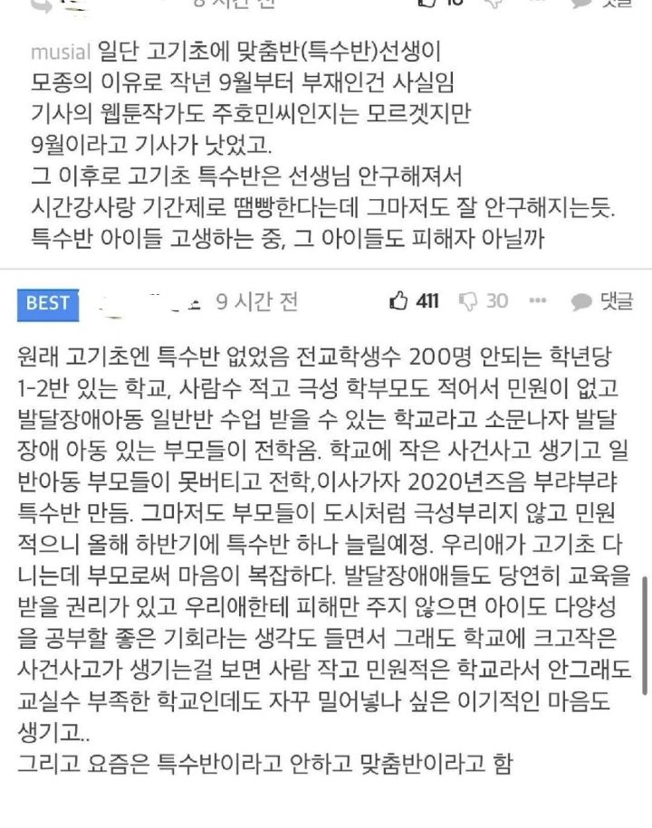 문제가 조금씩 생겼고 특수반이 생겼으나 민원이 적고 학교 분위기가 좋아 특수반이 늘어날 예정이었음