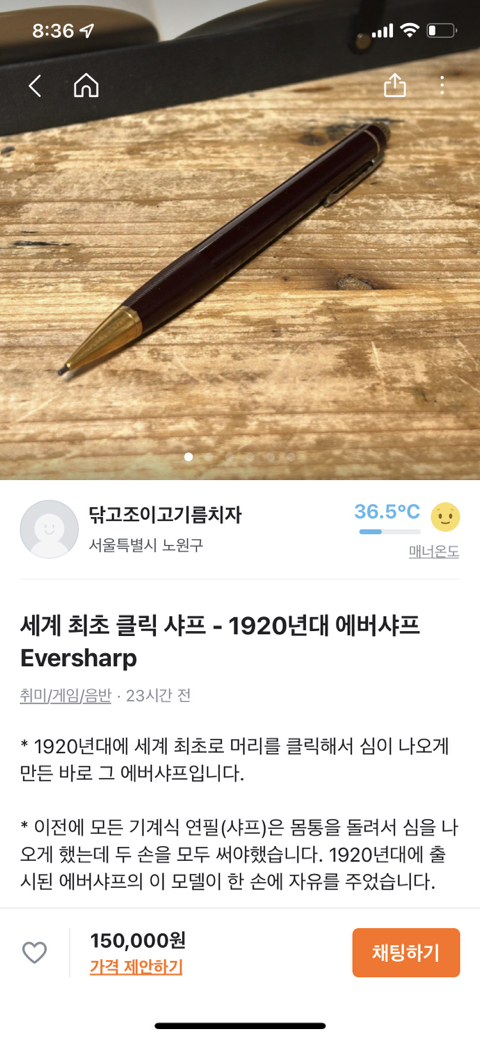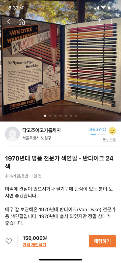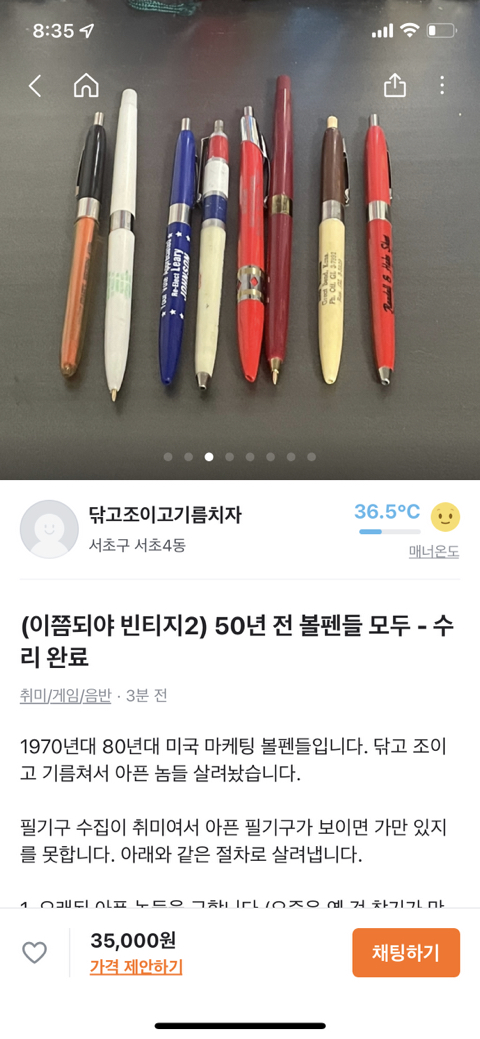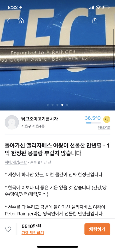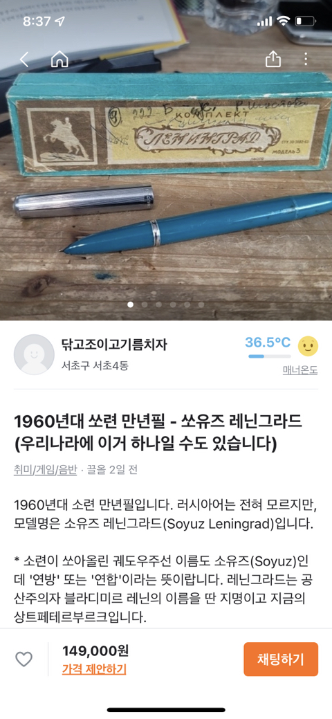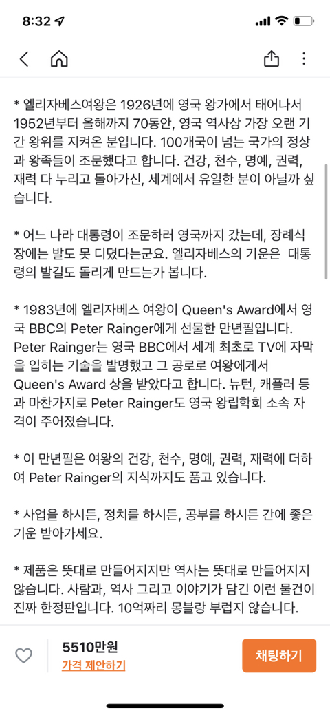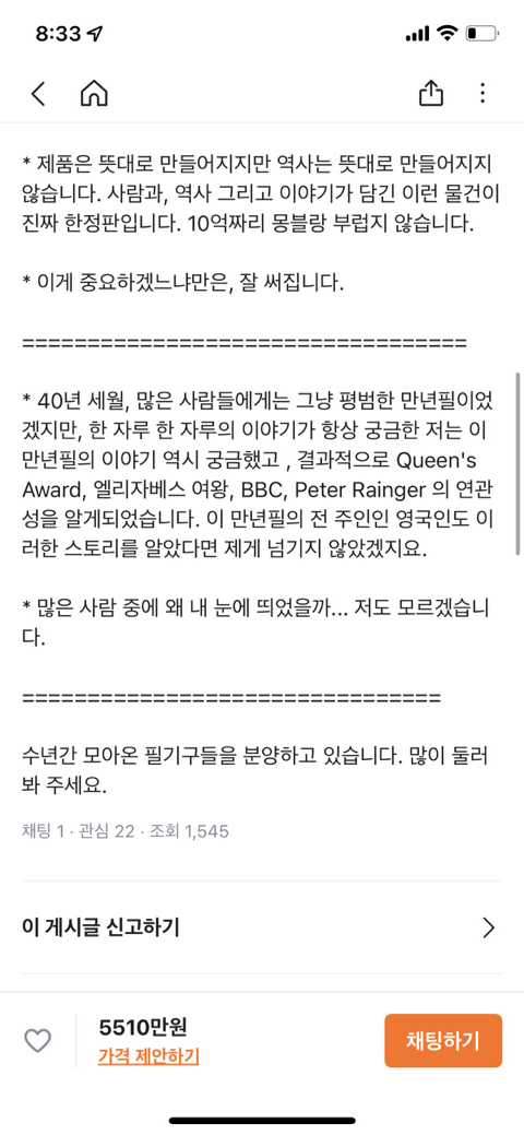 [스크랩] 당근마켓에 올라온 엘리자베스 여왕이 선물한 만년필 (ft. 5,510만원) 작성자별똥별|작성시간23.10.18|조회수433 목록 댓글 0 글자크기 작게가 글자크기 크게가 출처 : 여성시대 너에게는 내가 잘 어울린다이 외에도 이 판매자가 판매중인 상품들 보면지독한 빈티지 필기구 덕후로 보임(+) 고대 유물까지 모으나 봄도대체.. 뭐하는 분일까…문제시 삭제함.. 다음검색 스크랩 원문 : *여성시대* 차분한 20대들의 알흠다운 공간 현재 게시글 추가 기능 열기 북마크 공유하기 신고 센터로 신고 댓글 댓글 0 댓글쓰기 답글쓰기 댓글 리스트