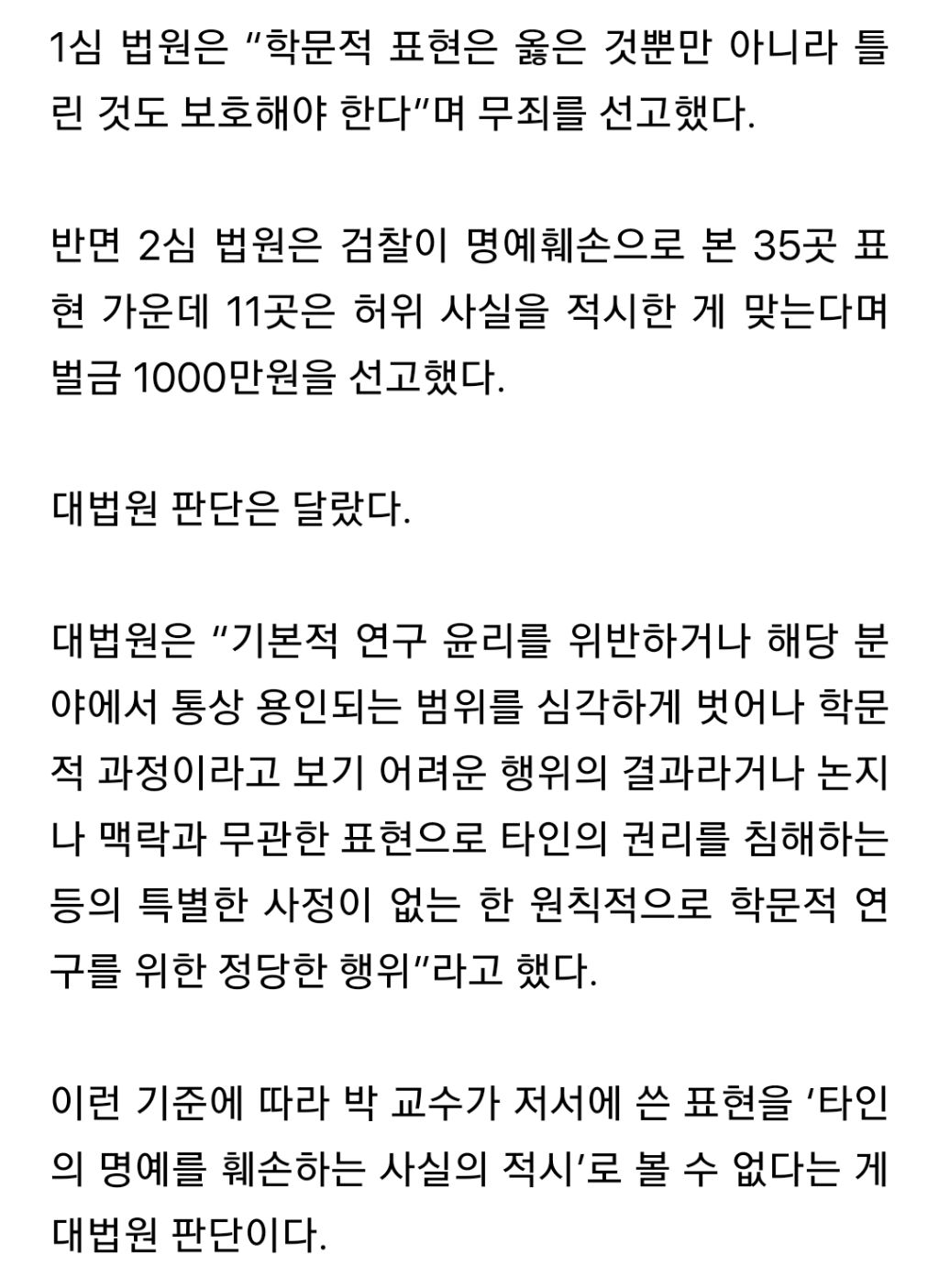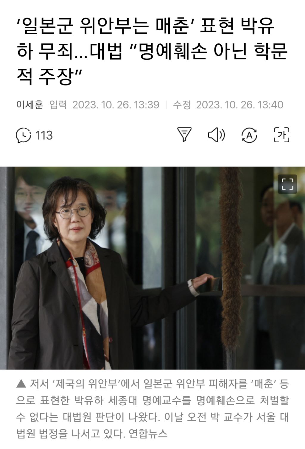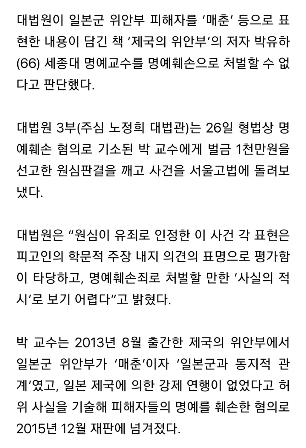 [스크랩] ‘일본군 위안부는 매춘’ 표현 박유하 무죄…대법 ”명예훼손 아닌 학문적 주장” 작성자바람의전설|작성시간23.10.26|조회수79 목록 댓글 0 글자크기 작게가 글자크기 크게가 https://v.daum.net/v/20231026133937715‘일본군 위안부는 매춘’ 표현 박유하 무죄…대법 ”명예훼손 아닌 학문적 주장”대법원이 일본군 위안부 피해자를 ‘매춘’ 등으로 표현한 내용이 담긴 책 ‘제국의 위안부’의 저자 박유하(66) 세종대 명예교수를 명예훼손으로 처벌할 수 없다고 판단했다. 대법원 3부(주심 v.daum.net 다음검색 스크랩 원문 : 이종격투기 현재 게시글 추가 기능 열기 북마크 공유하기 신고 센터로 신고 댓글 댓글 0 댓글쓰기 답글쓰기 댓글 리스트