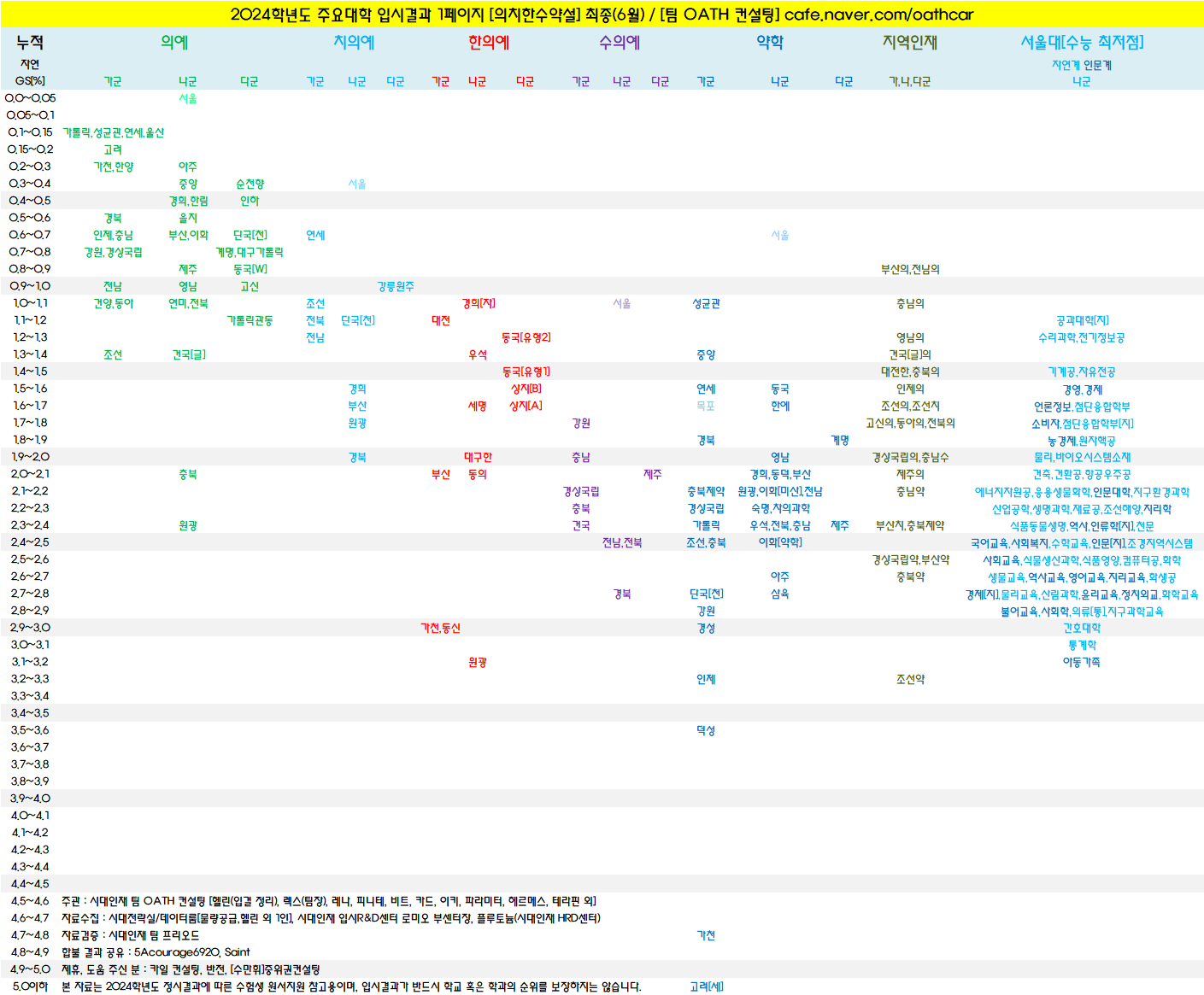 2024년 시대인재 문이과 통합 최종 입결 작성자동훈뷘|작성시간24.06.30|조회수2,558 목록 댓글 6 글자크기 작게가 글자크기 크게가 Sky 문과는 나름 선방그 아래 문과는 몰락 ㅜ 다음검색 현재 게시글 추가 기능 열기 북마크 공유하기 신고 센터로 신고 댓글 댓글 6 댓글쓰기 답글쓰기 댓글 리스트 답댓글 작성자동훈뷘 작성자 본인 여부 작성자 | 작성시간 24.06.30 ? 지금 한의대 고점인데 작성자남하진 | 작성시간 24.06.30 아아 한의대여 ㅠㅠ 작성자이쿠타 리라 | 작성시간 24.07.01 와 누적 3퍼가 연경제간다고? 중앙대경제 갈성적인디 답댓글 작성자이쿠타 리라 | 작성시간 24.07.01 짜파게티~ 이과는 의치대 포카가 있으니까 작성자하나로민원 | 작성시간 24.07.01 지금 연고대가 우리시대때 중경외시랑 비슷할듯. 댓글 전체보기