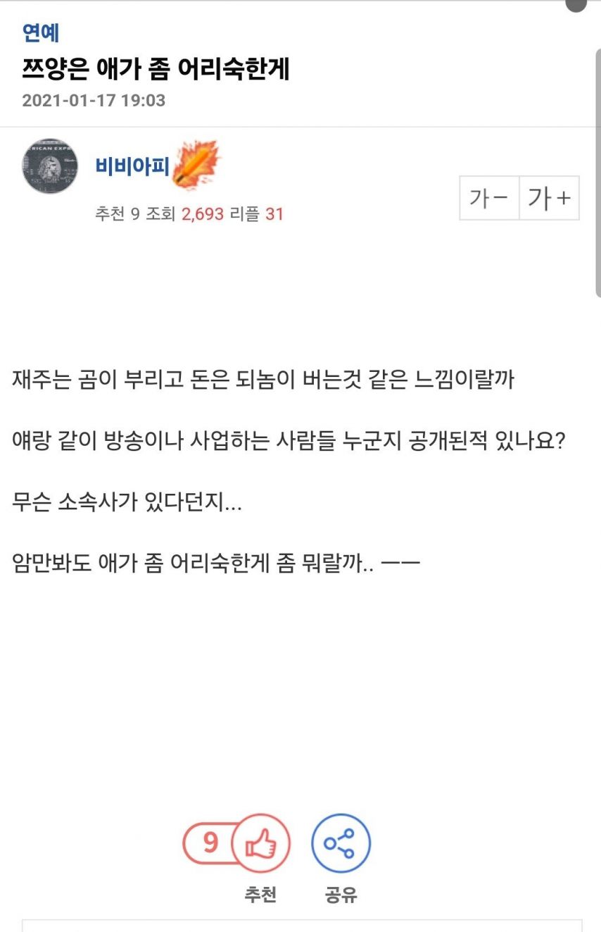 [스크랩] 진작부터 쯔양을 알아본 엠팍 유저 작성자시몬스침대|작성시간24.07.13|조회수589 목록 댓글 0 글자크기 작게가 글자크기 크게가 https://mlbpark.donga.com/mp/b.php?p=1&b=bullpen&id=202101170051346451&select=&query=&subselect=&subquery=&user=&site=&reply=&source=&pos=&sig=hgjTGg-YihRRKfX2hfj9Sl-gjhlq%E2%80%8C쯔양은 애가 좀 어리숙한게 : MLBPARK재주는 곰이 부리고 돈은 되놈이 버는것 같은 느낌이랄까얘랑 같이 방송이나 사업하는 사람들…mlbpark.donga.com게시글 성지화 되고있는 중 다음검색 스크랩 원문 : 樂soccer 현재 게시글 추가 기능 열기 북마크 공유하기 신고 센터로 신고 댓글 댓글 0 댓글쓰기 답글쓰기 댓글 리스트