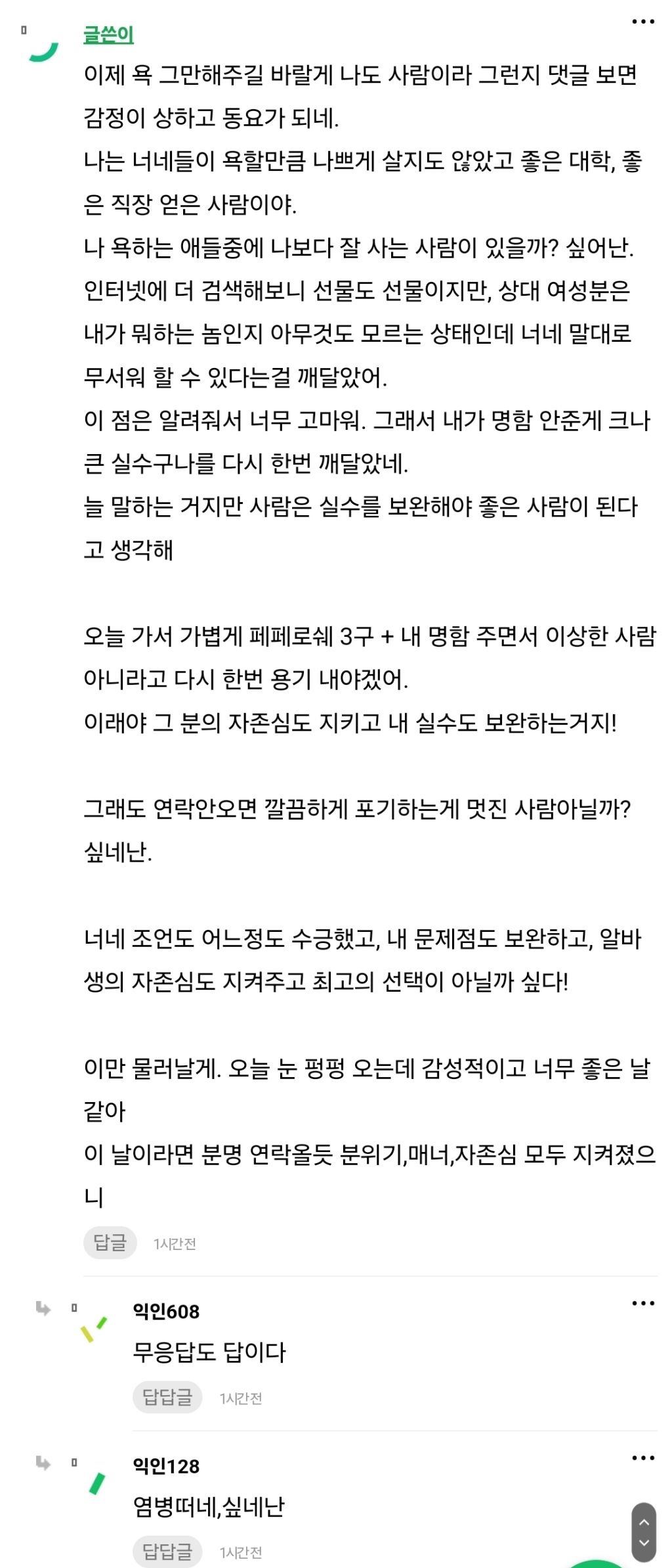 [스크랩] 카페 알바생 번호 따고싶은데 한 번 거절당함 작성자바람의전설|작성시간24.08.04|조회수487 목록 댓글 2 글자크기 작게가 글자크기 크게가 다음검색 스크랩 원문 : 이종격투기 현재 게시글 추가 기능 열기 북마크 공유하기 신고 센터로 신고 댓글 댓글 2 댓글쓰기 답글쓰기 댓글 리스트 작성자ukrina | 작성시간 24.08.04 더 이상 잃을 것이 없는 남자의 고백공격만큼 강려크한 것도 없지 작성자통모짜핫도그 | 작성시간 24.08.04 310 진짜 팬다 너 ㅋㅋㅋㅋㅋㅋㅋㅋㅋㅋ 댓글 전체보기