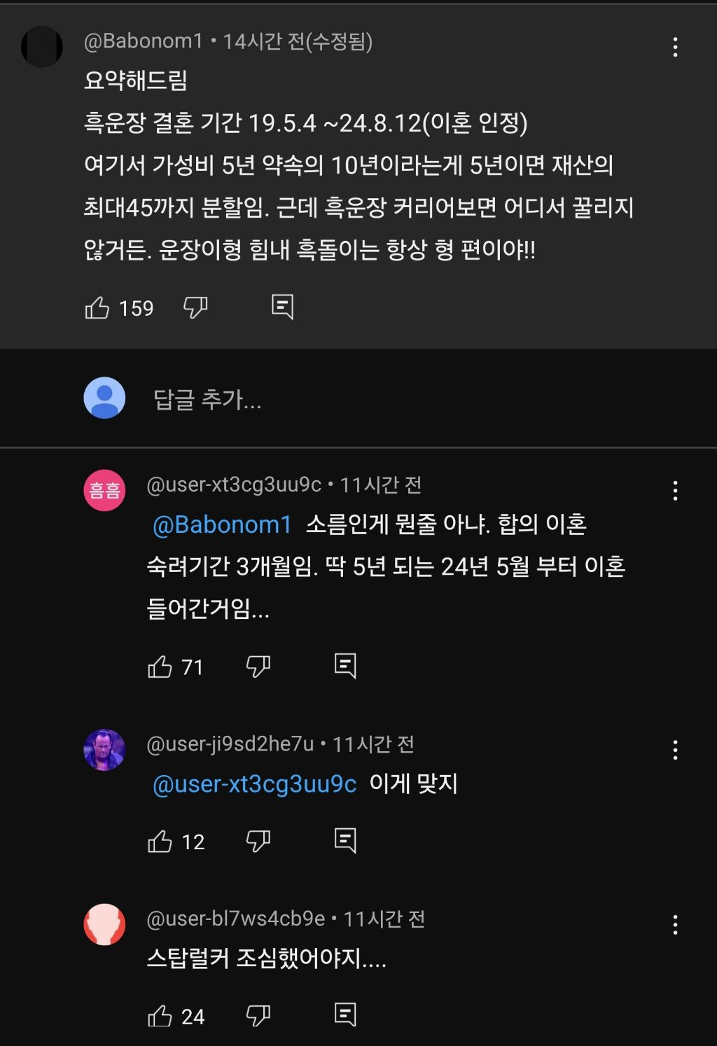 가성비의 5년 약속의 10년 작성자페더러|작성시간24.08.26|조회수1,994 목록 댓글 13 글자크기 작게가 글자크기 크게가 요즘 이혼은 이혼전문변호사 상담받고 철저하게 준비한다는군스탑러커를 조심하라!위 당사자는 우연히 각방쓰고, 우연히 애가 없고, 우연히 딱 5년만에 이혼하는 사례로 보이니 억측은 자제하자 다음검색 현재 게시글 추가 기능 열기 북마크 공유하기 신고 센터로 신고 댓글 댓글 13 댓글쓰기 답글쓰기 댓글 리스트 작성자황족 서울러 | 작성시간 24.08.26 Do the laundry T.T 작성자향가향가 | 작성시간 24.08.26 누구임 답댓글 작성자선배녀 | 작성시간 24.08.26 프로게이머 이성은 모름? 답댓글 작성자향가향가 | 작성시간 24.08.26 선배녀 전자오락하는 놈들 모름 작성자갈까마귀 | 작성시간 24.08.26 그래도 이혼녀 타이틀 달리면서까지 굳이...? 댓글 전체보기