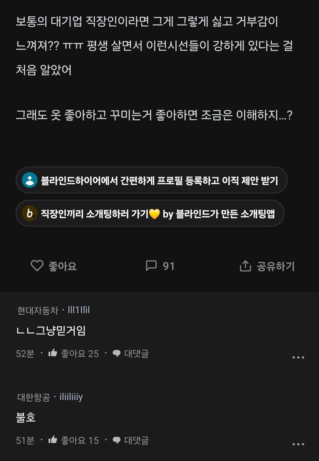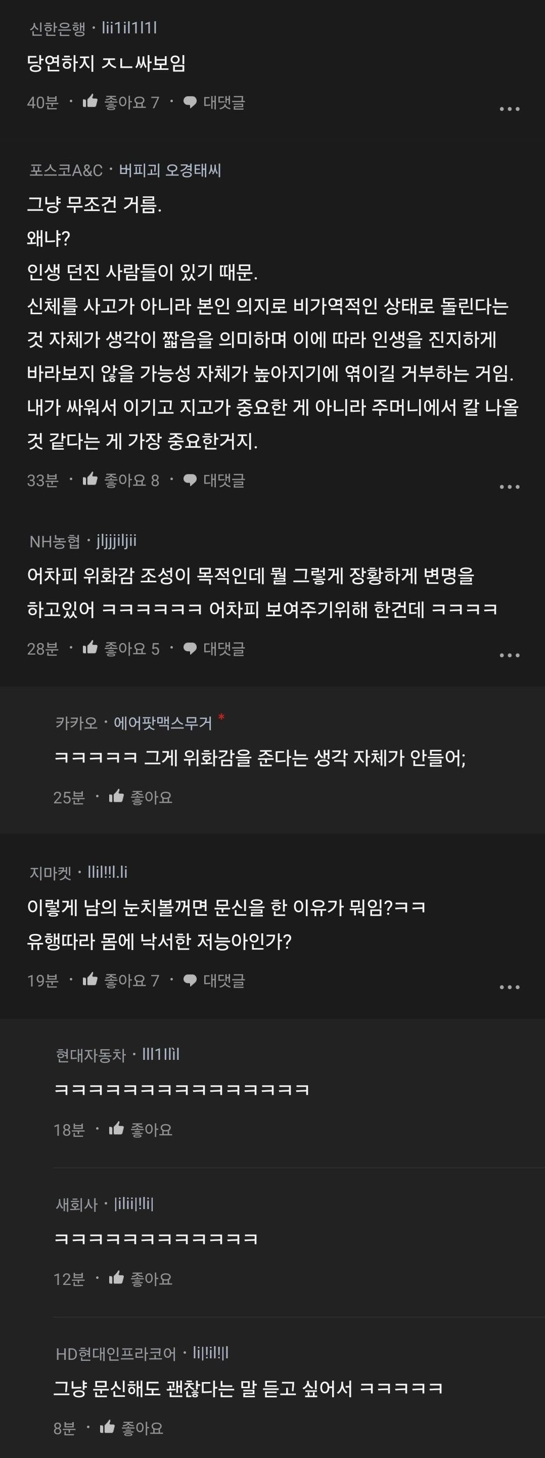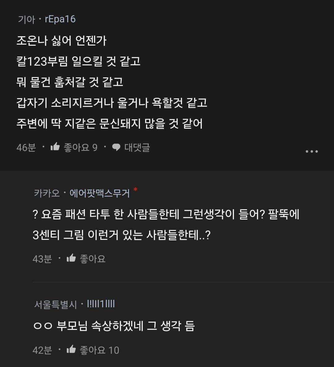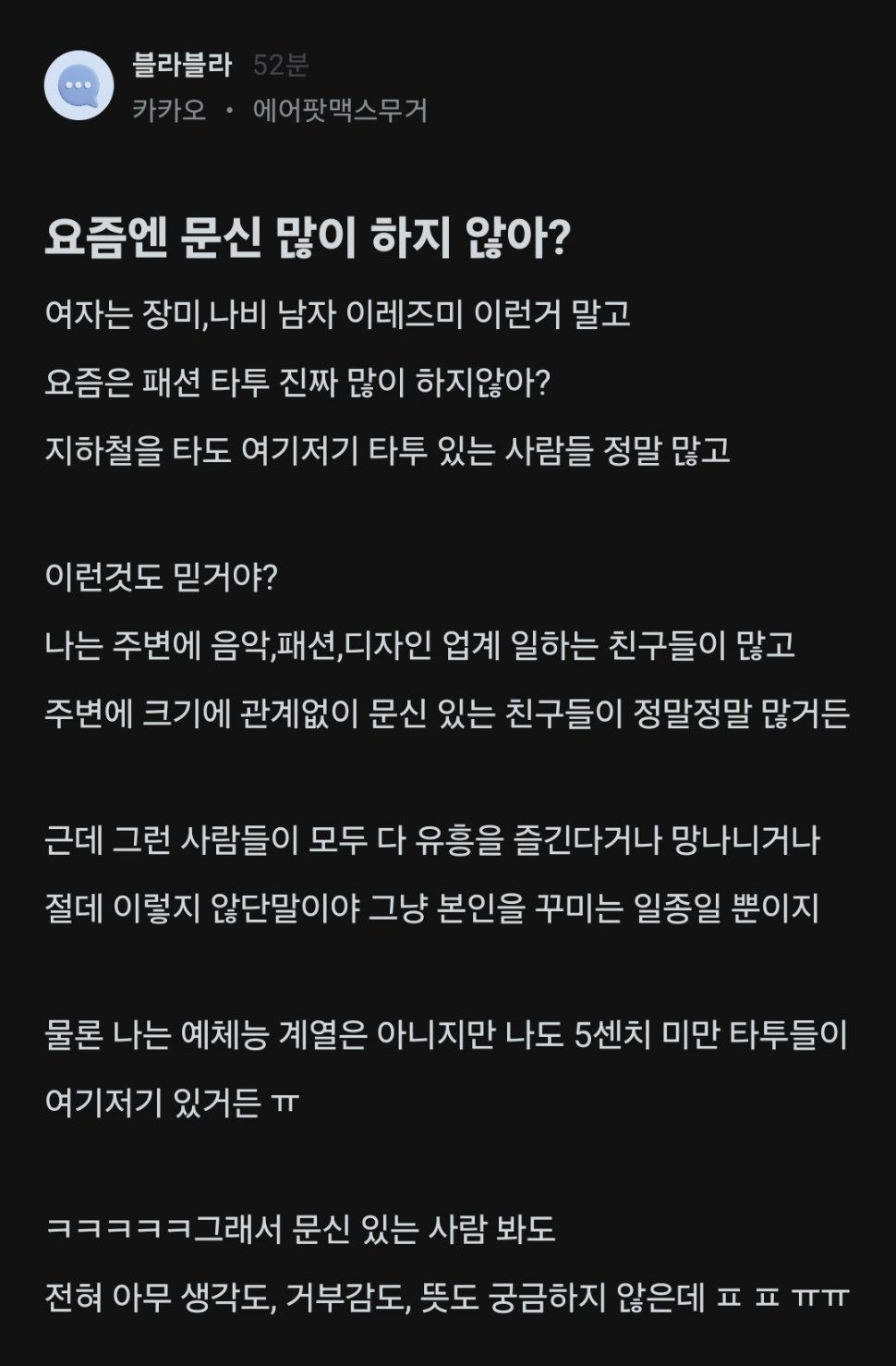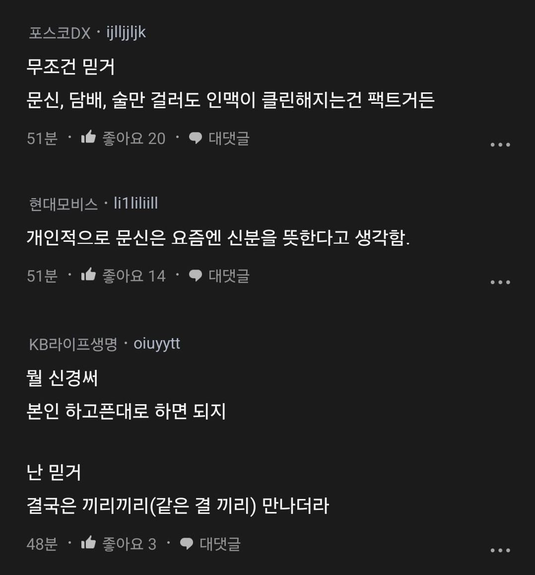 블라) 요즘 문신 많이하는데 대기업도 문신 거르냐는 여자 작성자선배녀|작성시간25.04.08|조회수565 목록 댓글 4 글자크기 작게가 글자크기 크게가 다음검색 현재 게시글 추가 기능 열기 북마크 공유하기 신고 센터로 신고 댓글 댓글 4 댓글쓰기 답글쓰기 댓글 리스트 작성자ukrina | 작성시간 25.04.08 신중하지 못한 성격 + 청소용 수건 + 양아치 문신한 사람들을 자주 접하는 자영업자들 왈 편견이 아니라 과학이라고 함 작성자Ralph-Lauren | 작성시간 25.04.08 무조건 믿거 작성자▲로진▲ | 작성시간 25.04.08 고양이 키우는것이랑 비슷함 작성자클럽모나코 | 작성시간 25.04.08 문신 = 충동적으로 무언갈 할 확률이 높다는 거. 댓글 전체보기