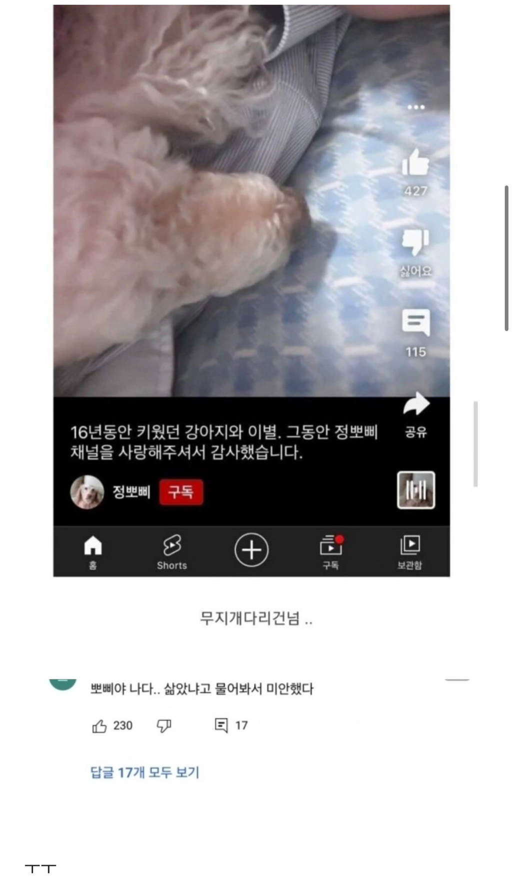 무지개 다리 건넌 정뽀삐 작성자21대 대통령|작성시간25.04.12|조회수421 목록 댓글 3 글자크기 작게가 글자크기 크게가 ㅠㅠ 다음검색 현재 게시글 추가 기능 열기 북마크 공유하기 신고 센터로 신고 댓글 댓글 3 댓글쓰기 답글쓰기 댓글 리스트 작성자Ralph-Lauren | 작성시간 25.04.12 꼴녀야.. 답댓글 작성자21대 대통령 작성자 본인 여부 작성자 | 작성시간 25.04.12 왜 랄프옵 ㅠㅠ 뽀삐 살려줘 ㅜㅜ 작성자고개양이 | 작성시간 25.04.13 ㅠㅜ 댓글 전체보기