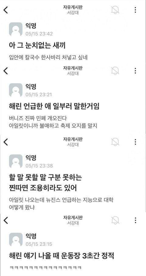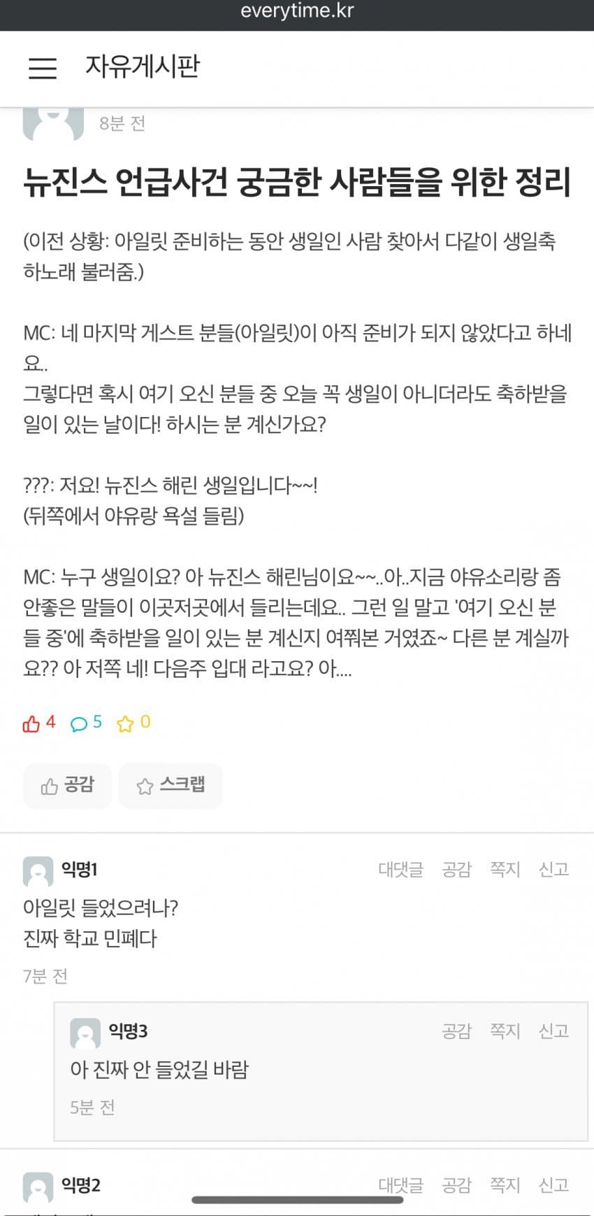[스크랩] 서강대 축제에서 민폐 부리고 야유랑 욕설 먹은 뉴진스팬 작성자시몬스침대|작성시간25.06.20|조회수1,165 목록 댓글 1 글자크기 작게가 글자크기 크게가 아일릿 무대 준비 하는데 뉴진스 언급해서 야유랑 욕설 먹음 당연히 여론도 안좋음. 근데 MC 위기대처능력이랑 회피기동이 쩔었음 다음검색 스크랩 원문 : 樂soccer 현재 게시글 추가 기능 열기 북마크 공유하기 신고 센터로 신고 댓글 댓글 1 댓글쓰기 답글쓰기 댓글 리스트 작성자따조 | 작성시간 25.06.20 역시 싸패토끼단 댓글 전체보기