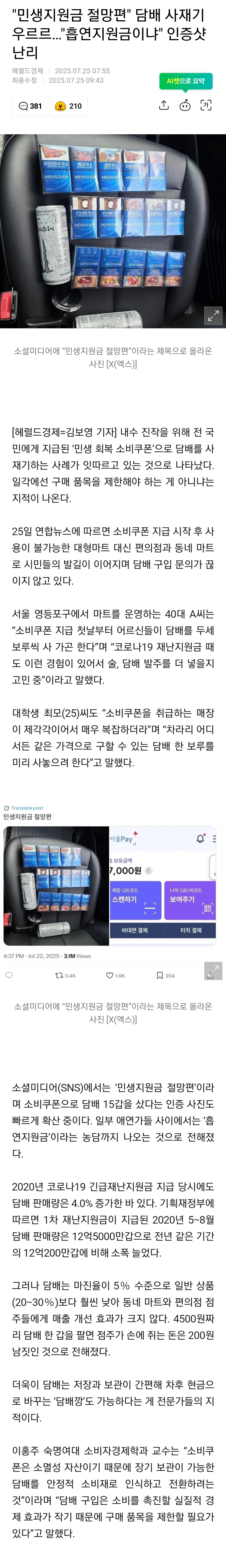 민생지원금으로 담배 사재기 인증샷 논란 작성자선배녀(안웃게)|작성시간25.07.25|조회수258 목록 댓글 4 글자크기 작게가 글자크기 크게가 다음검색 현재 게시글 추가 기능 열기 북마크 공유하기 신고 센터로 신고 댓글 댓글 4 댓글쓰기 답글쓰기 댓글 리스트 작성자하랏촤 | 작성시간 25.07.25 어쨌든 돈은 돌았죠? 담배면 세금도 많이 들어오니 된거 아니냐 작성자엠쥐 | 작성시간 25.07.25 뭐 문제 있나 작성자▲로진▲ | 작성시간 25.07.25 직장인 어짜피 밖에서 점심 먹으며 돈쓰는데 똑같은거 아닌가 담배도 되파는것도 아니고 지가 피고소진할껀데 작성자떠블쎆쓰501 | 작성시간 25.07.25 냅둬라 지가 담배피겠다는데 담배는안되고 음시점술은되고 그런건아니잖아 이게왜논란이지 댓글 전체보기
